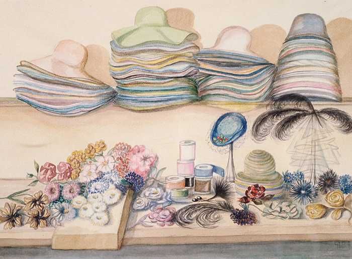 Aquarel, stilleven, met stapels hoeden op hoedenplan...