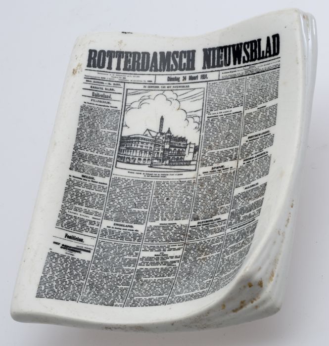 Porseleinen asbak met reclame "Rotterdamsch Nieuwsblad"
