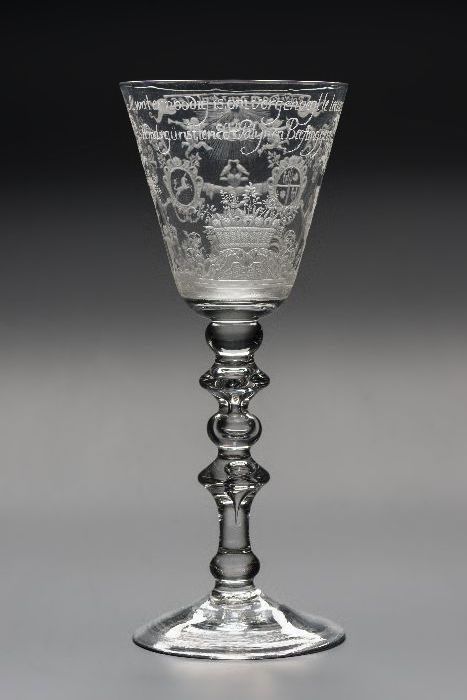 Kelkglas, bokaal met gegraveerde medaillons en "Het ...