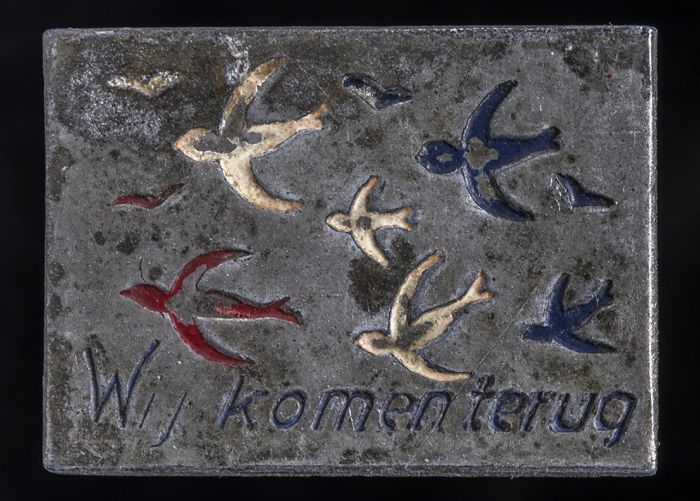 Speldje met vogels en "Wij komen terug"