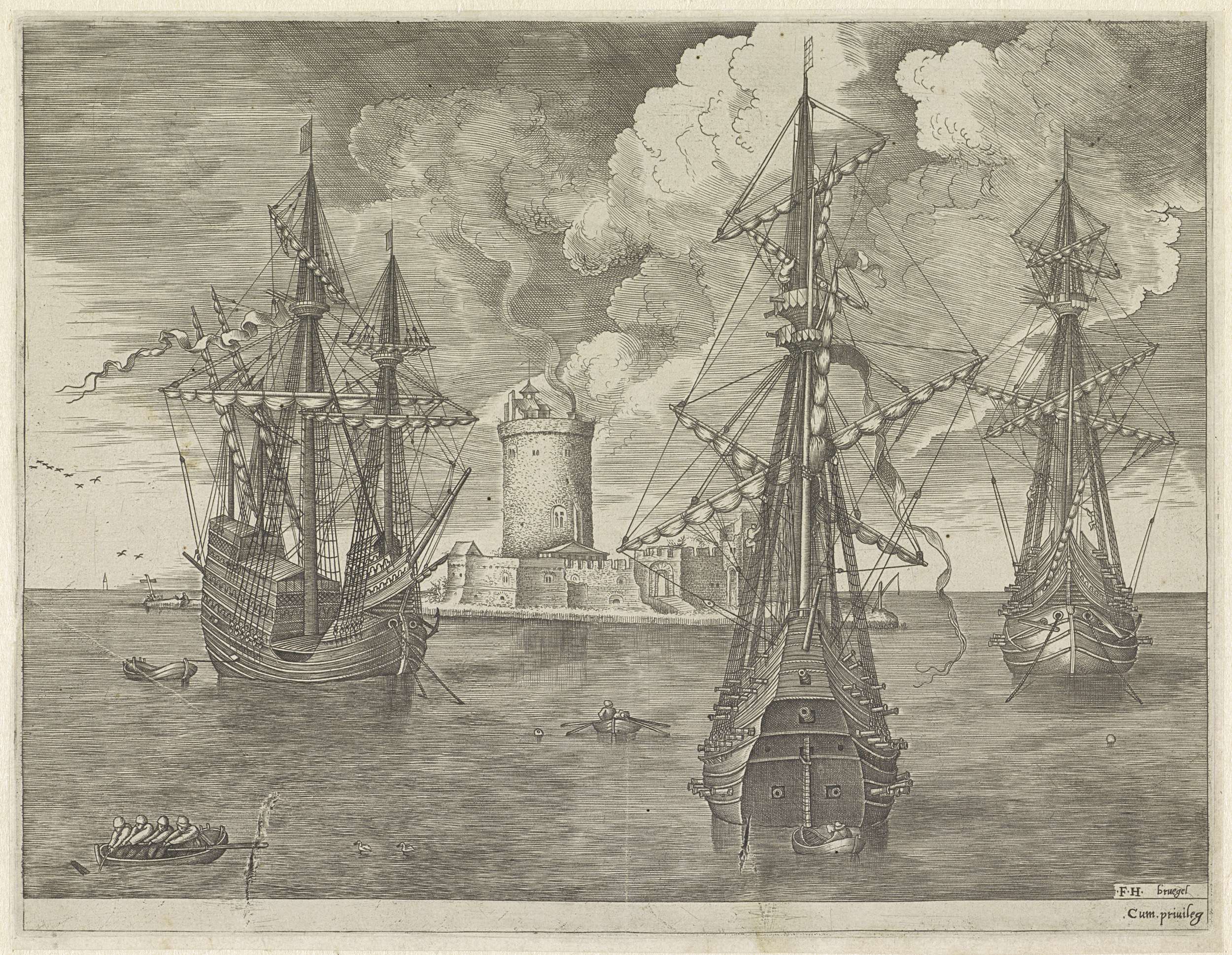 Drie oorlogsschepen voor anker bij een vuurtoren