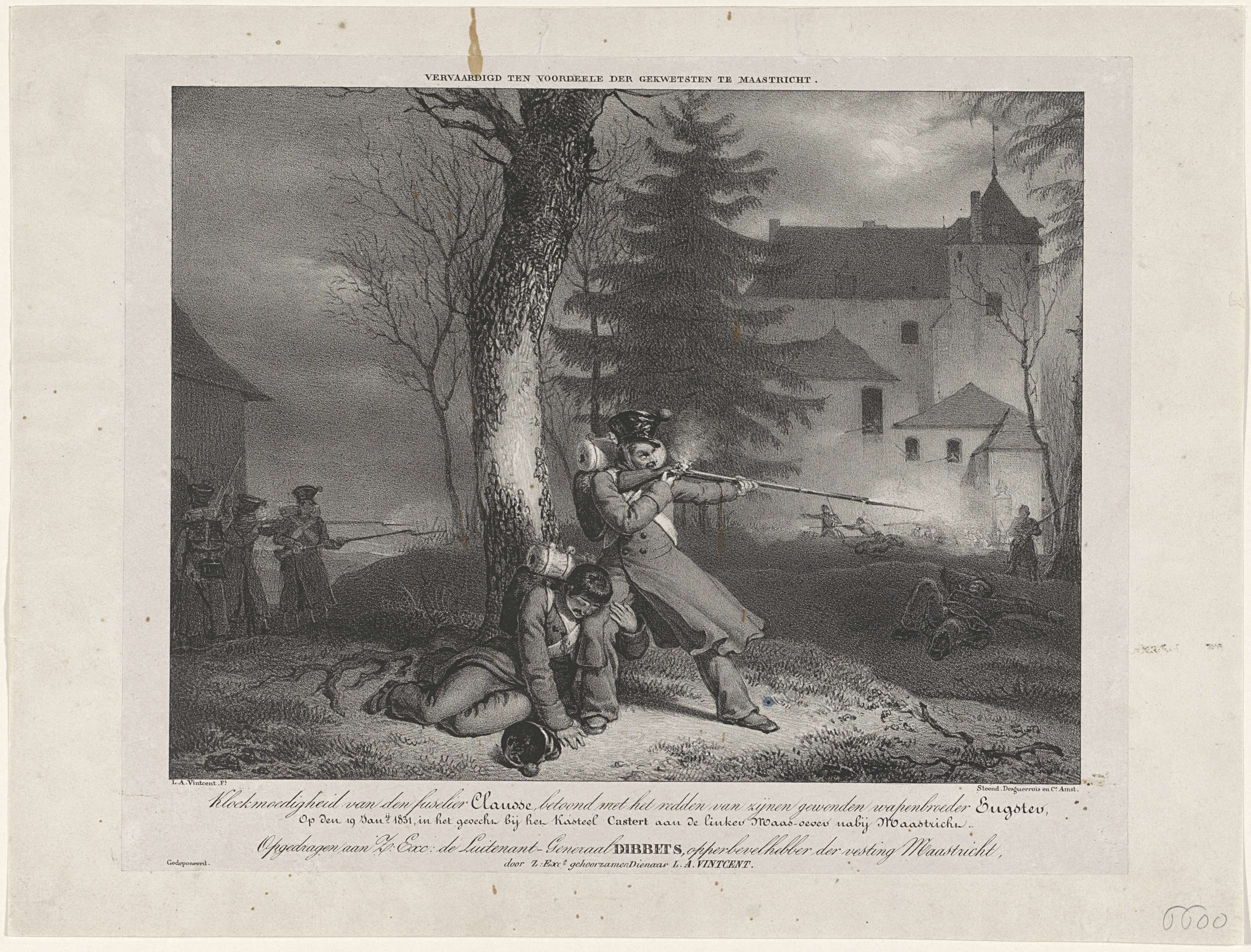 Twee gesneuvelde paarden waarvan de rechter van de z...