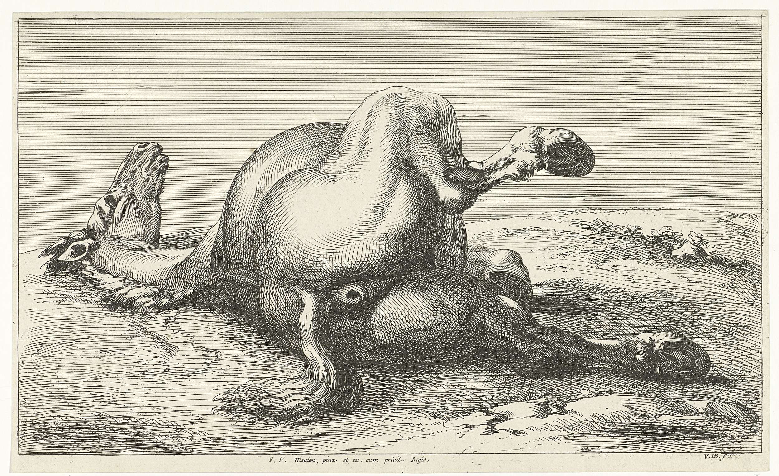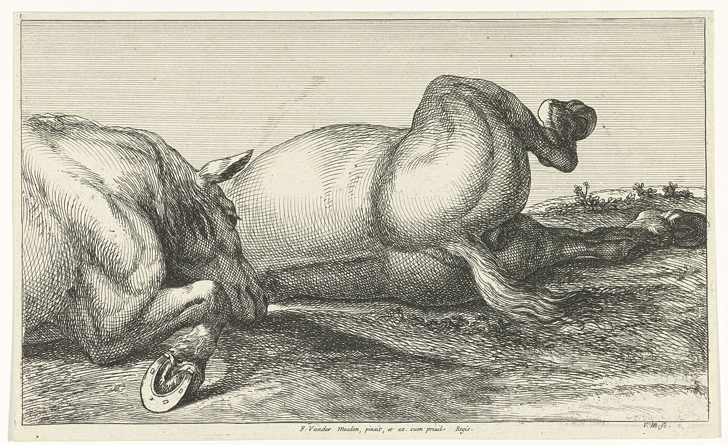 Twee gesneuvelde paarden waarvan de linker van voren...