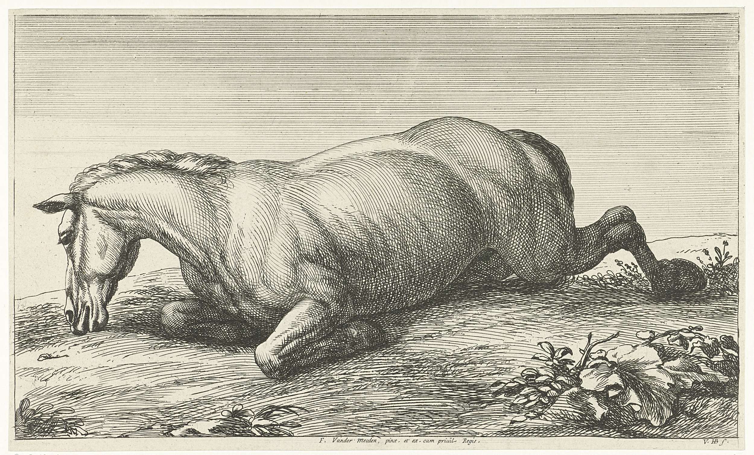 Twee gesneuvelde paarden waarvan de rechter van de z...