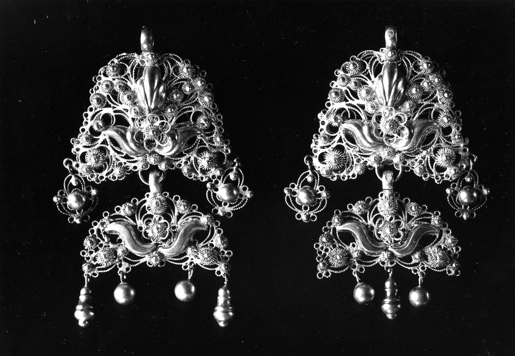 Paar oorijzerhangers, Noord-Beveland, 1956 (zwart-wi...