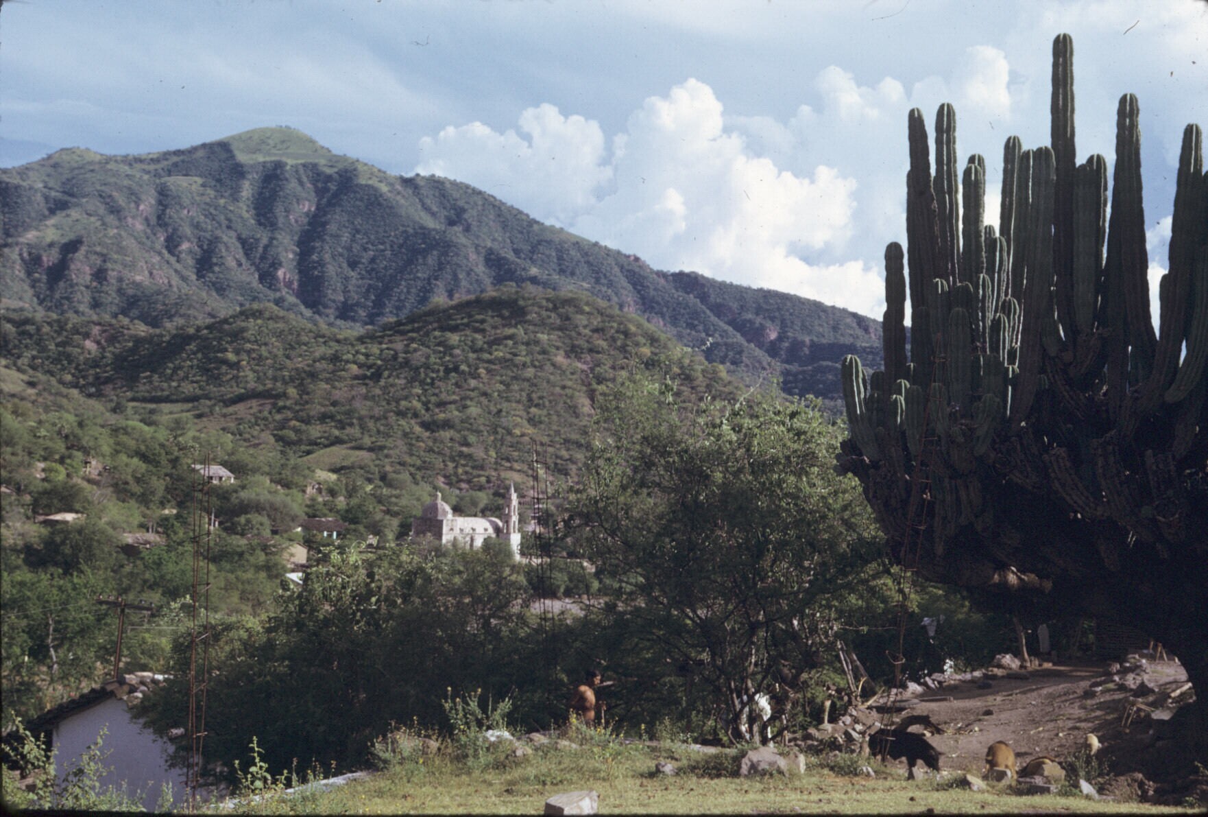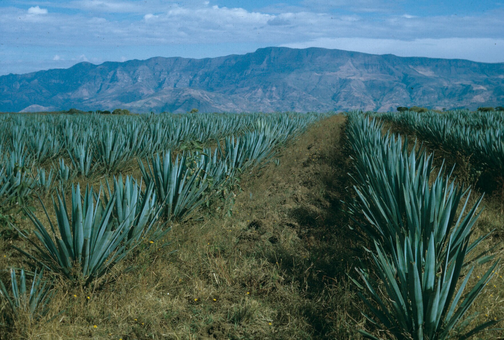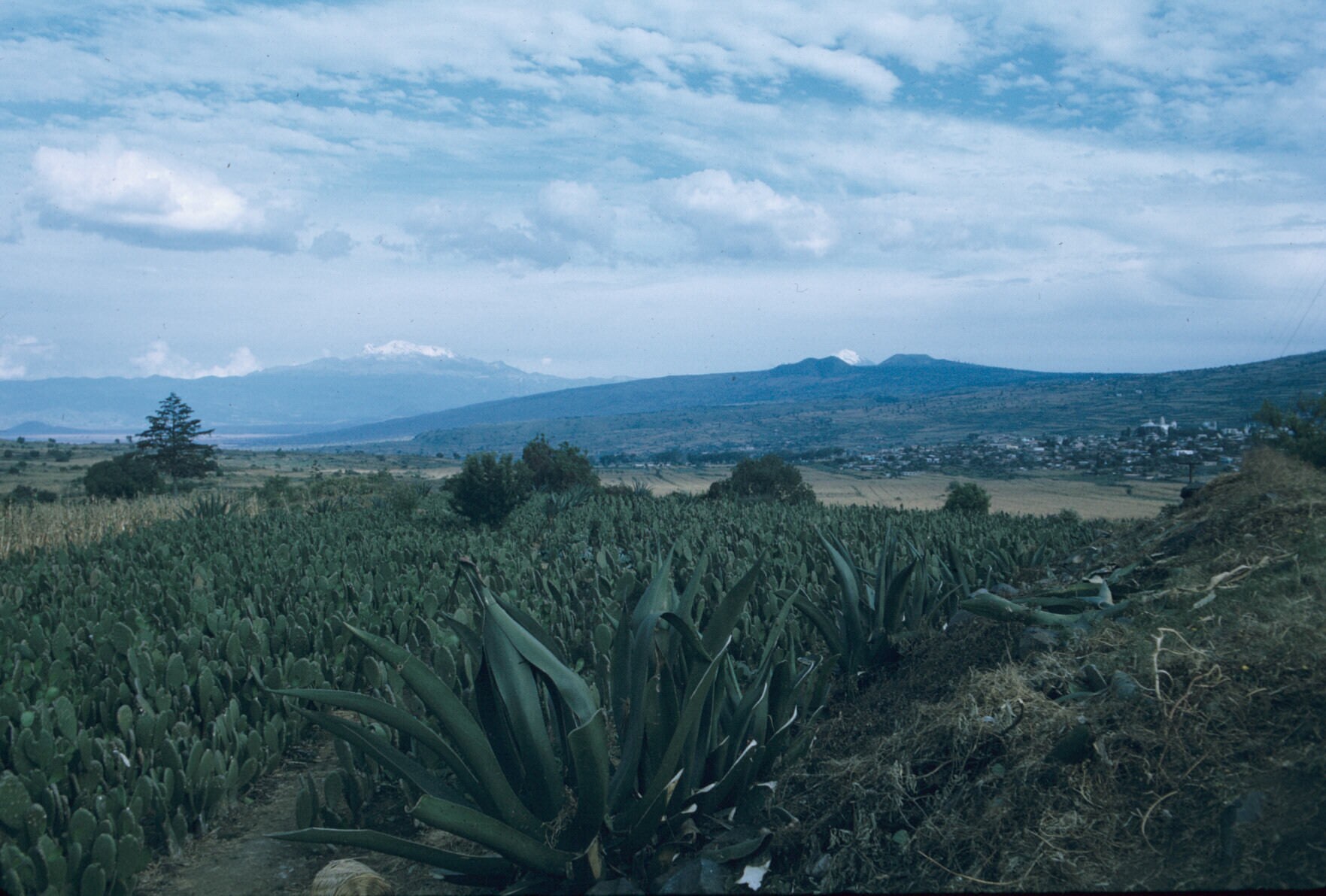 opuntiaplantage met agave op voorgrond; aan horizon:...