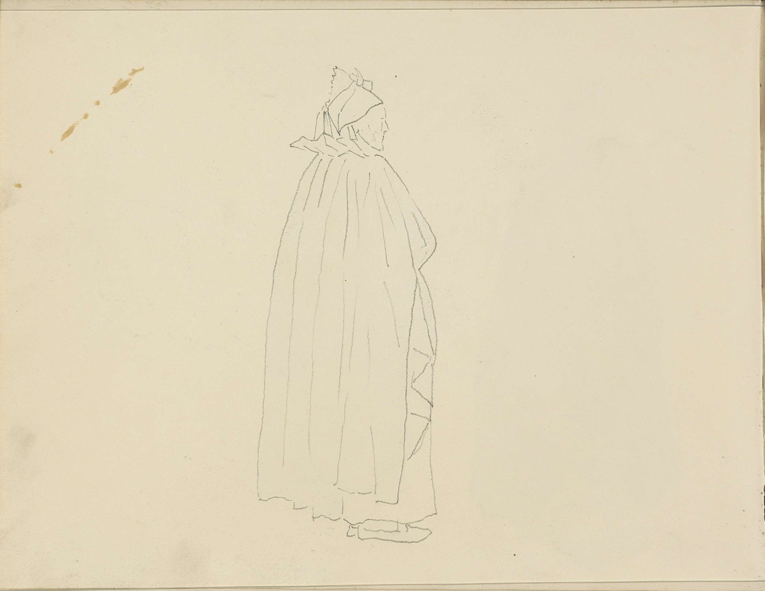 Vrouw in een lange mantel en kap, van opzij gezien