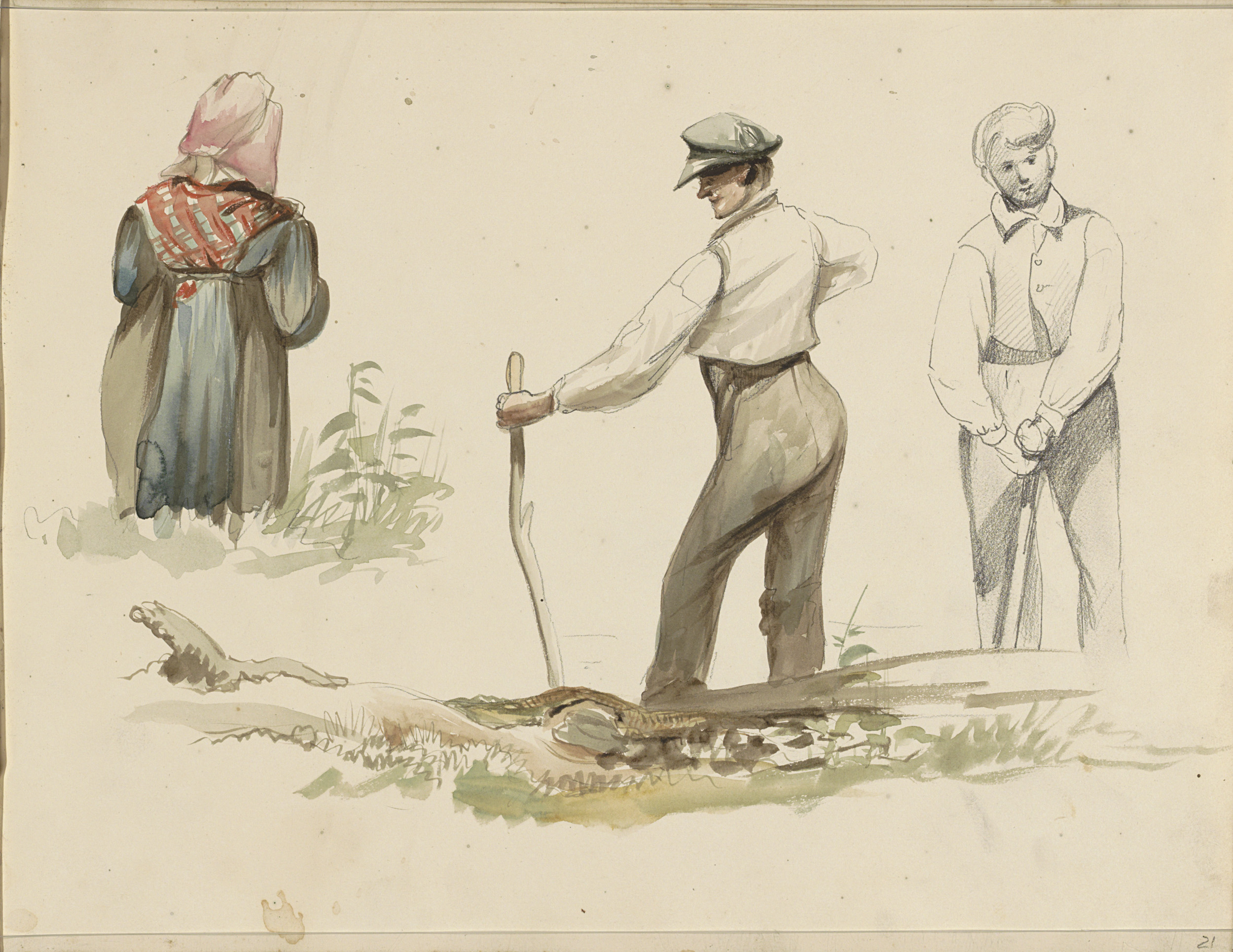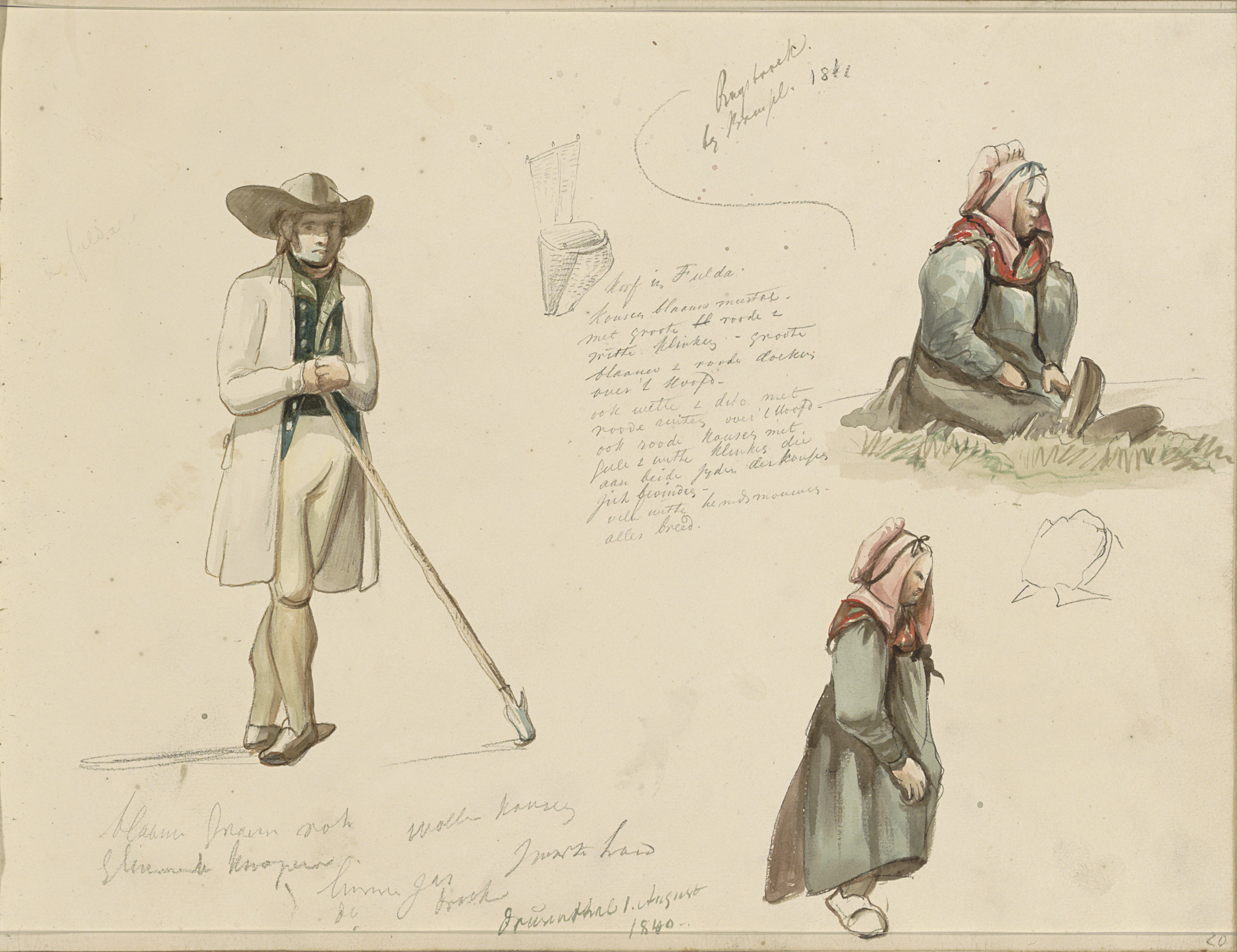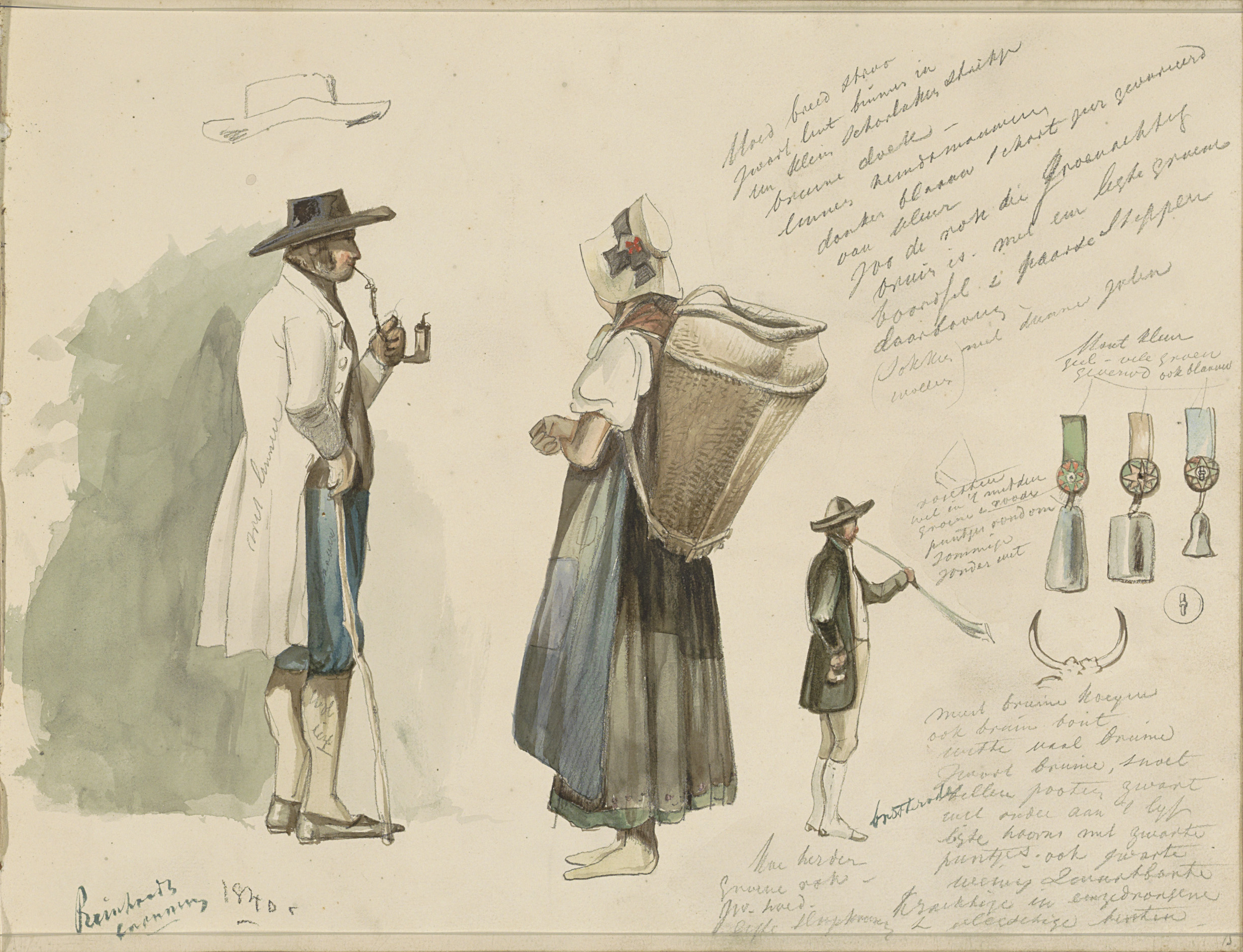 Pijprokende man, vrouw met mand, rozetten en een jac...