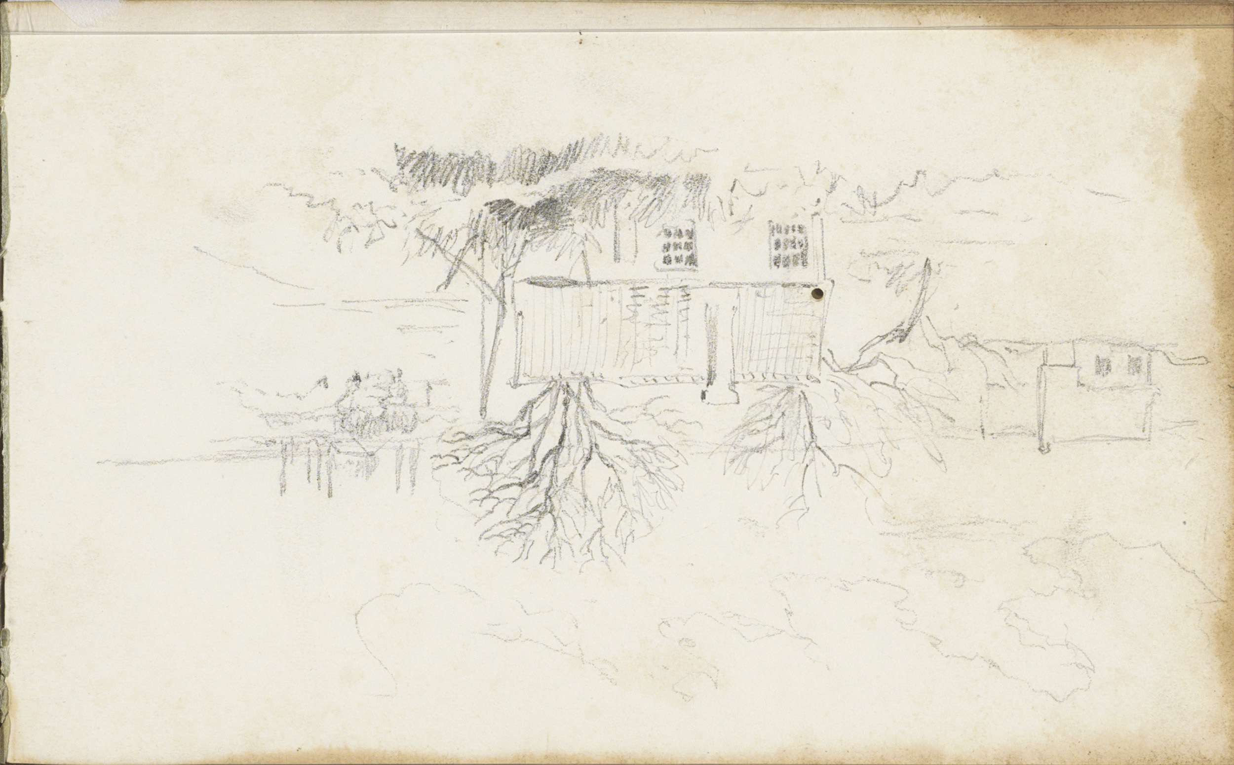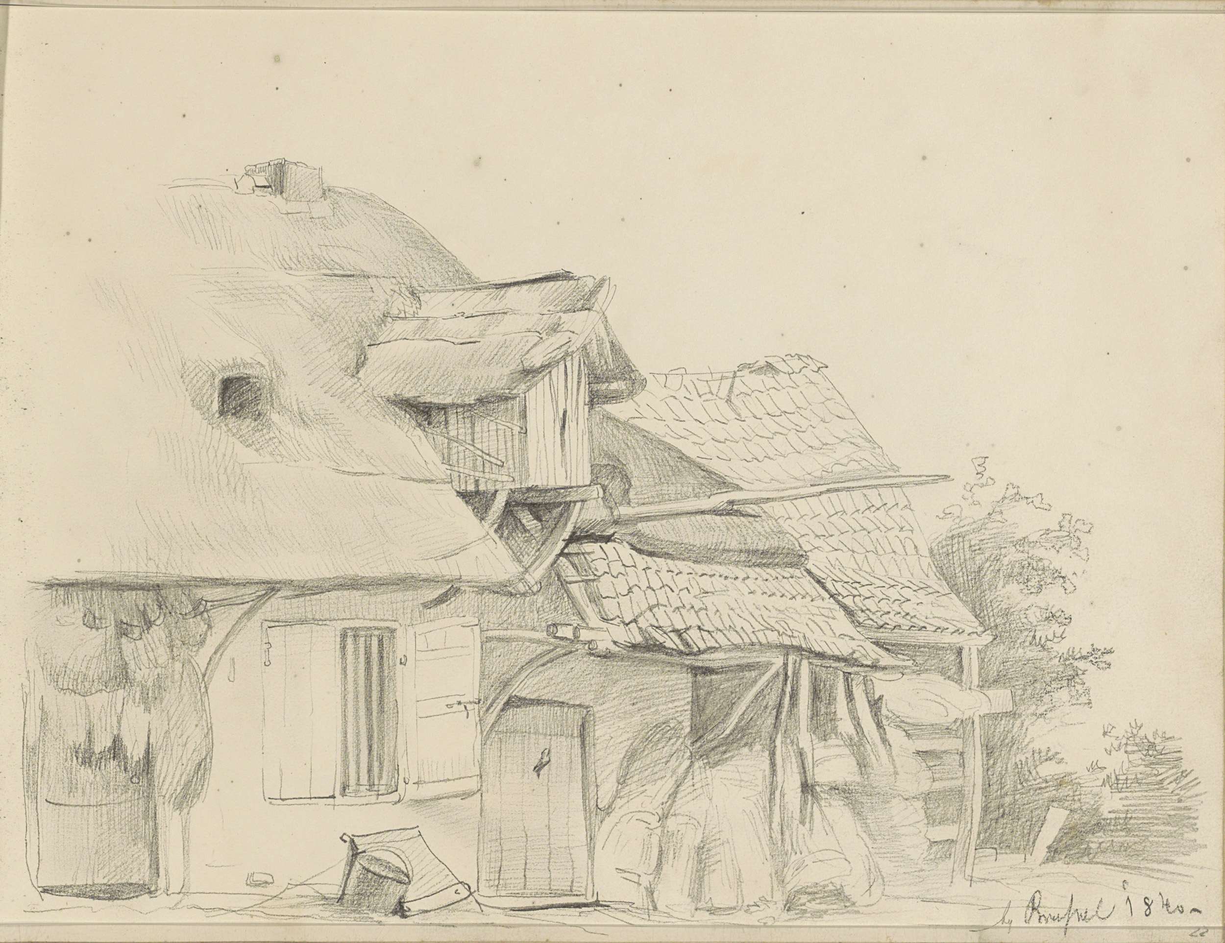 Figuur bij een huis met rieten dak in een boomrijke ...