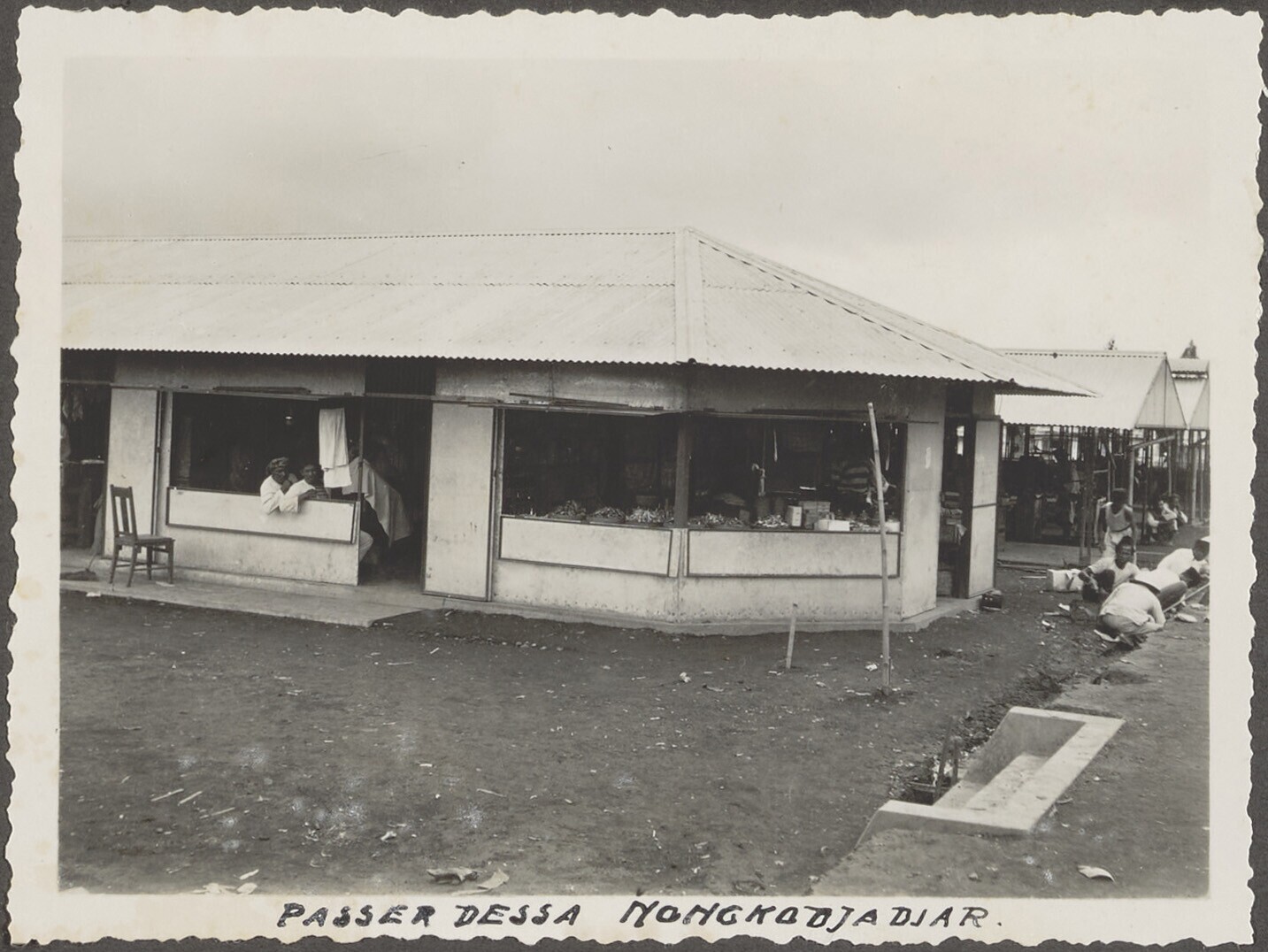 Gezicht op de marktgebouwen van de desa Nongkodjadjar