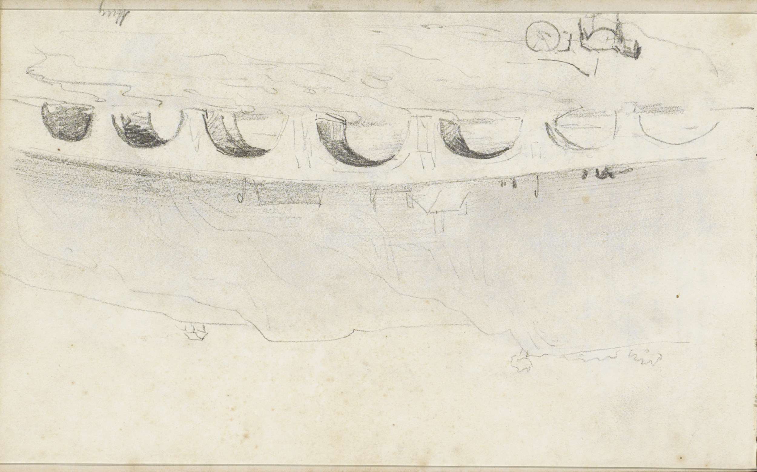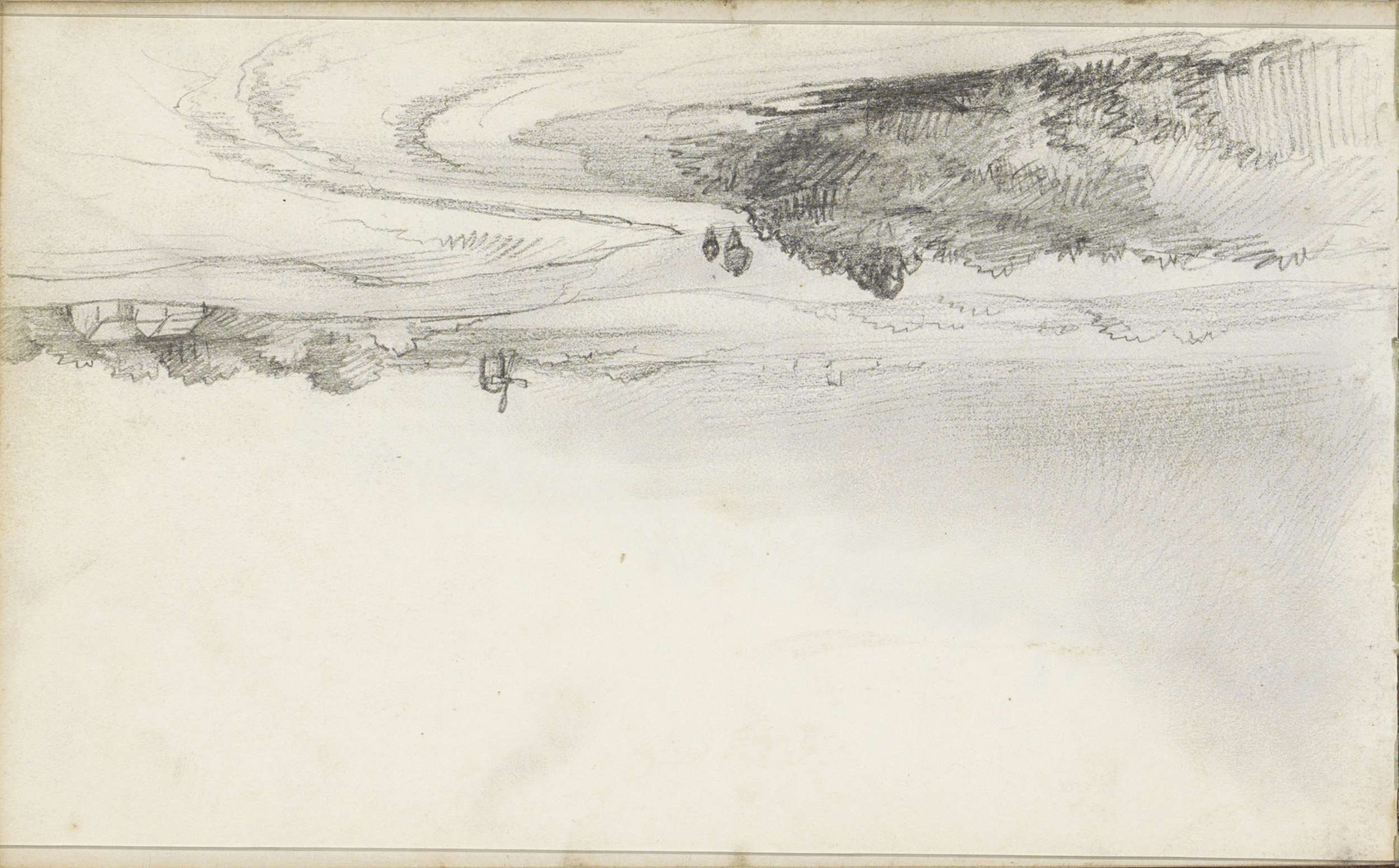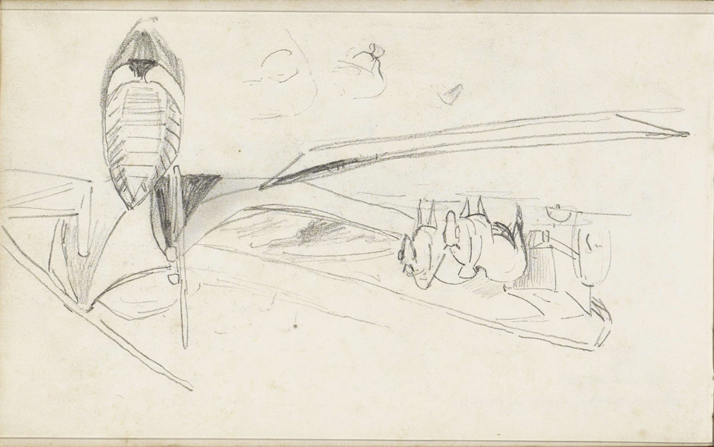 Boten en een ossenkar aan de oever van een rivier