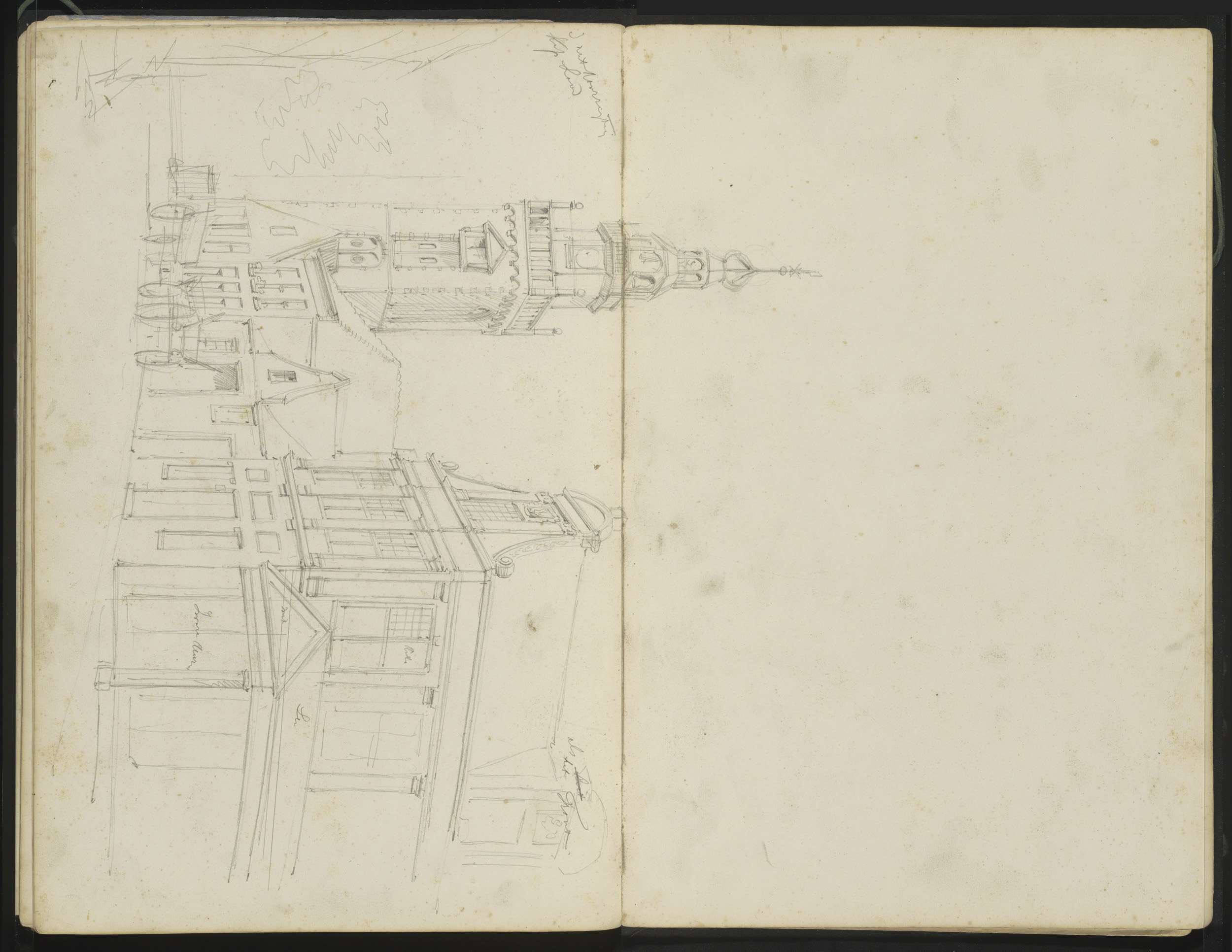 Stadsgezicht met de toren van de Grote Kerk te Monni...