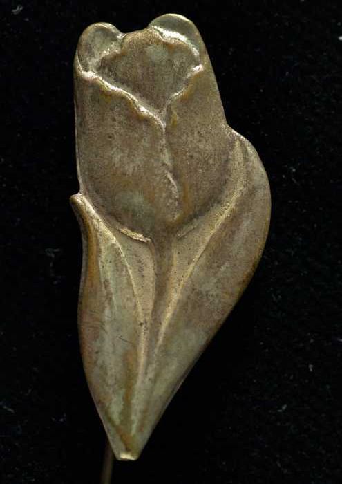 Metalen draagspeld met bloeiende tulp met twee bladeren