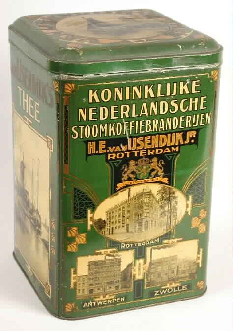Theeblik met "koninklijke nederlandsche stoomkoffieb...