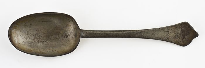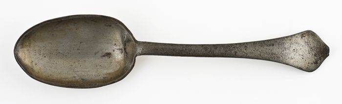 Tinnen lepel met Engelmerk in steel achterzijde boven