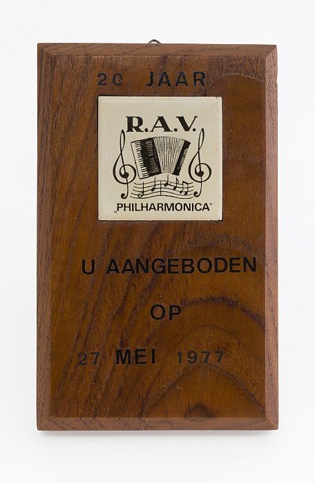 Schild met "20 Jaar R.A.V. 'Philharmonica', U aangeb...