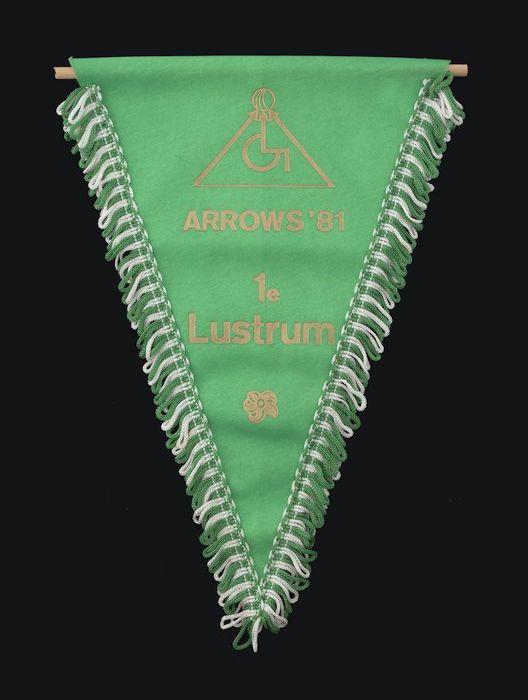 Driehoekig groen clubvaantje met "Arrows '81, 1e Lus...