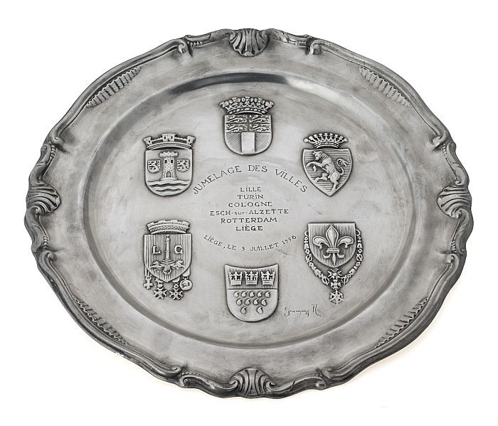 Tinnen bord met stadswapens van Lille, Turijn, Keule...