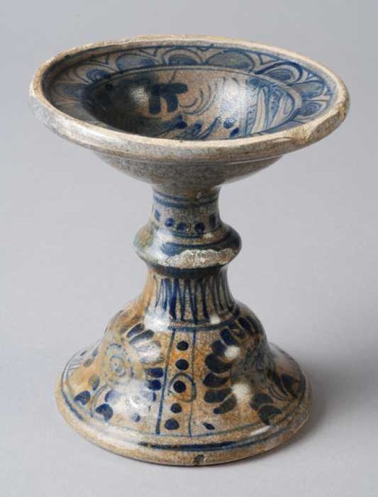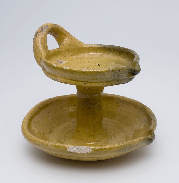 Geel geglazuurde aardewerk olielamp met twee schalen...