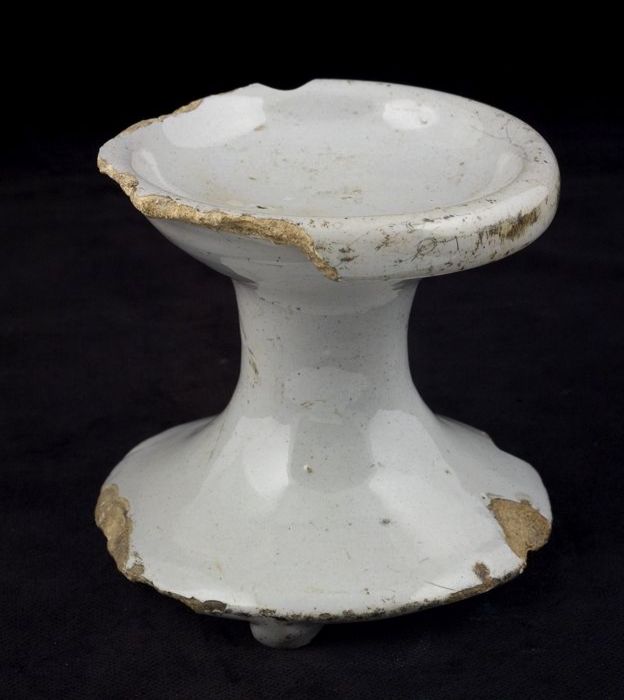 Aardewerk zoutschaal op kolom, wit geglazuurd, drie ...