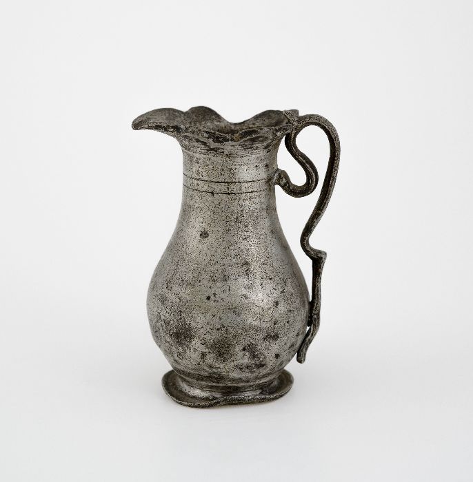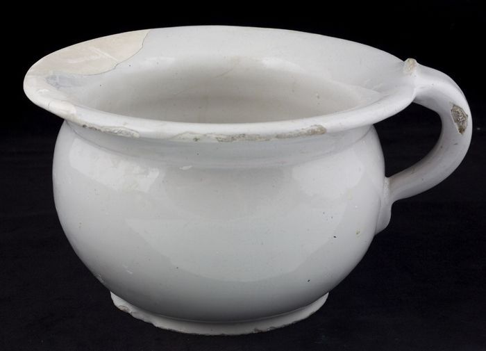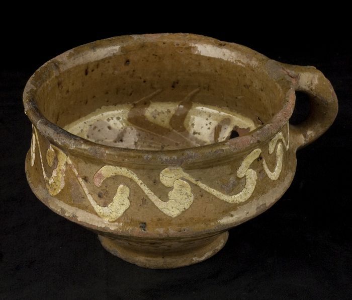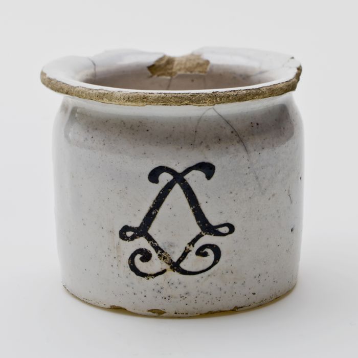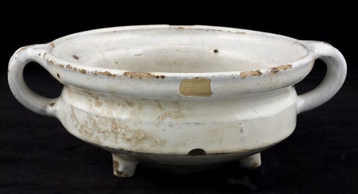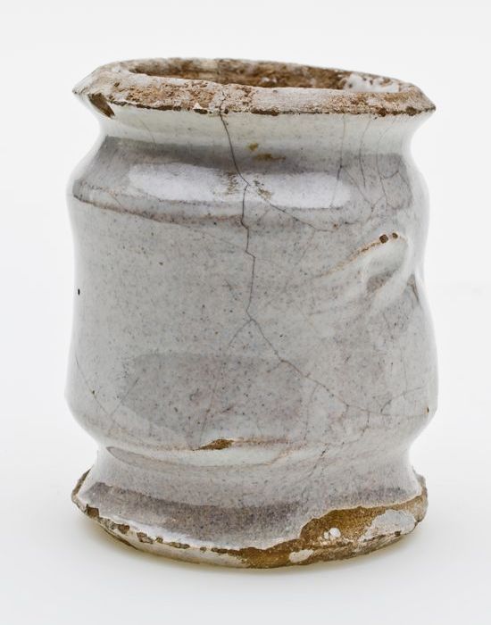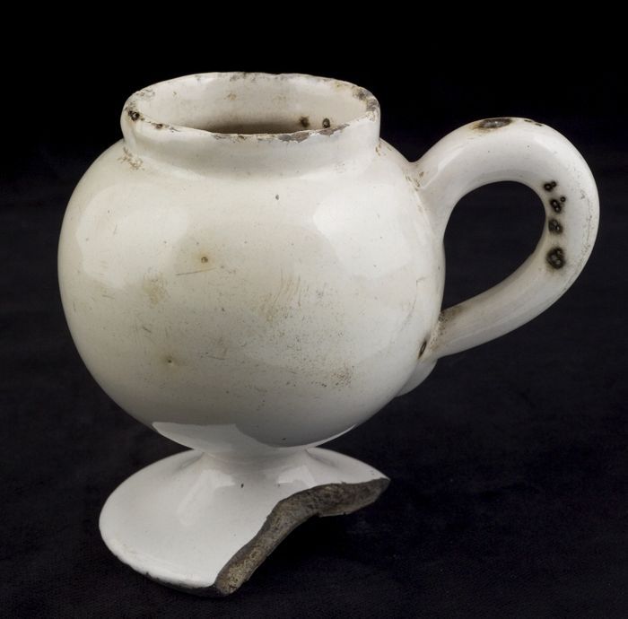 Aardewerk mosterdpot met oor, op standvoet, wit gegl...