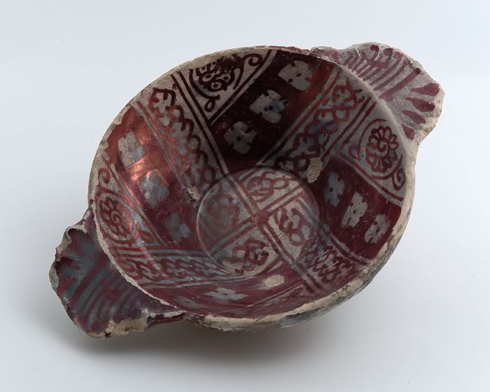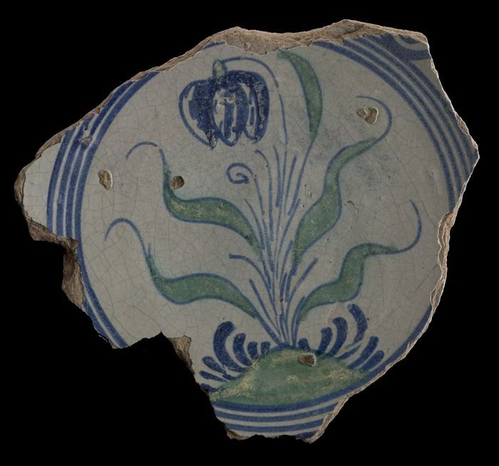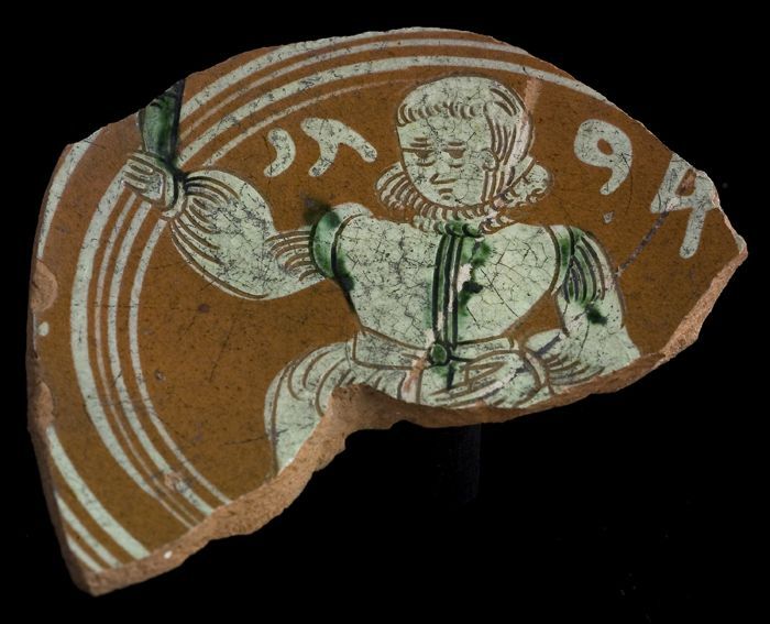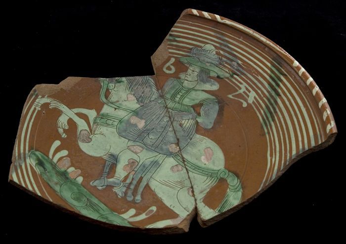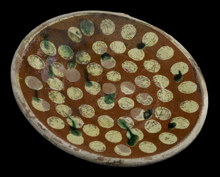 Sgraffito schotel, komvormig met geel-groene bloemmo...