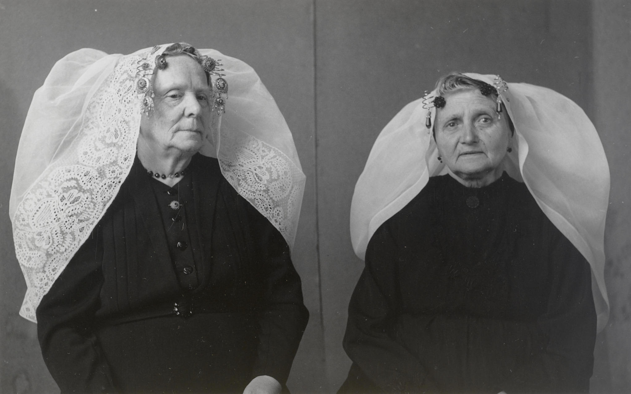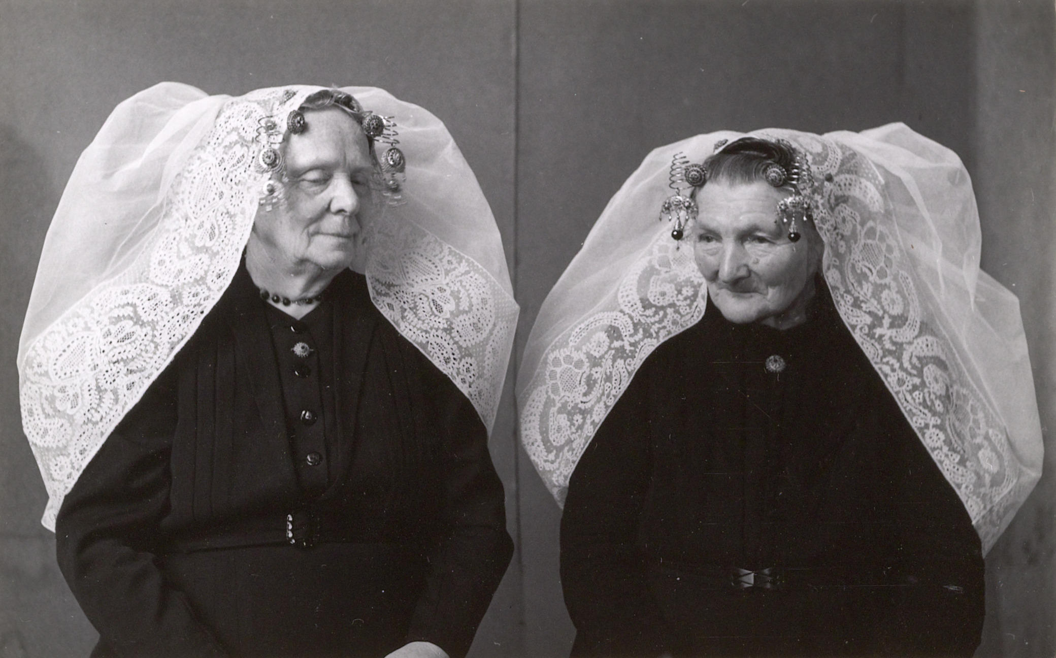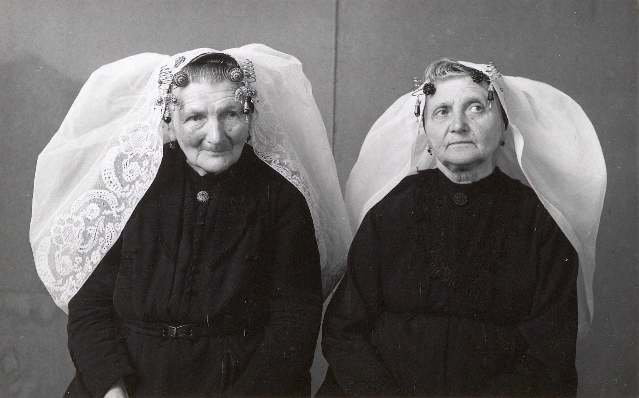 Twee vrouwen in Noord-Bevelandse dracht, 1956 (zwart...