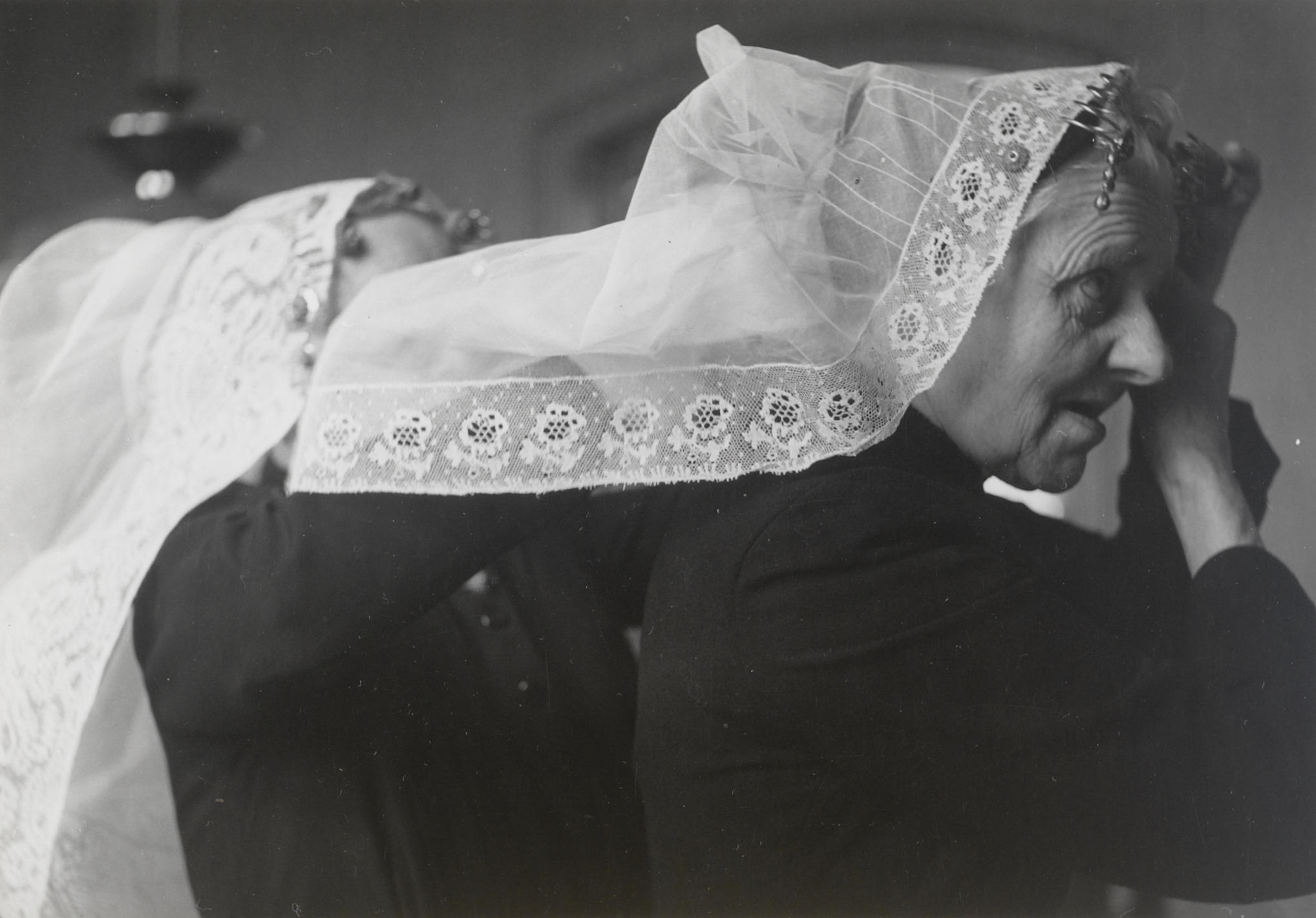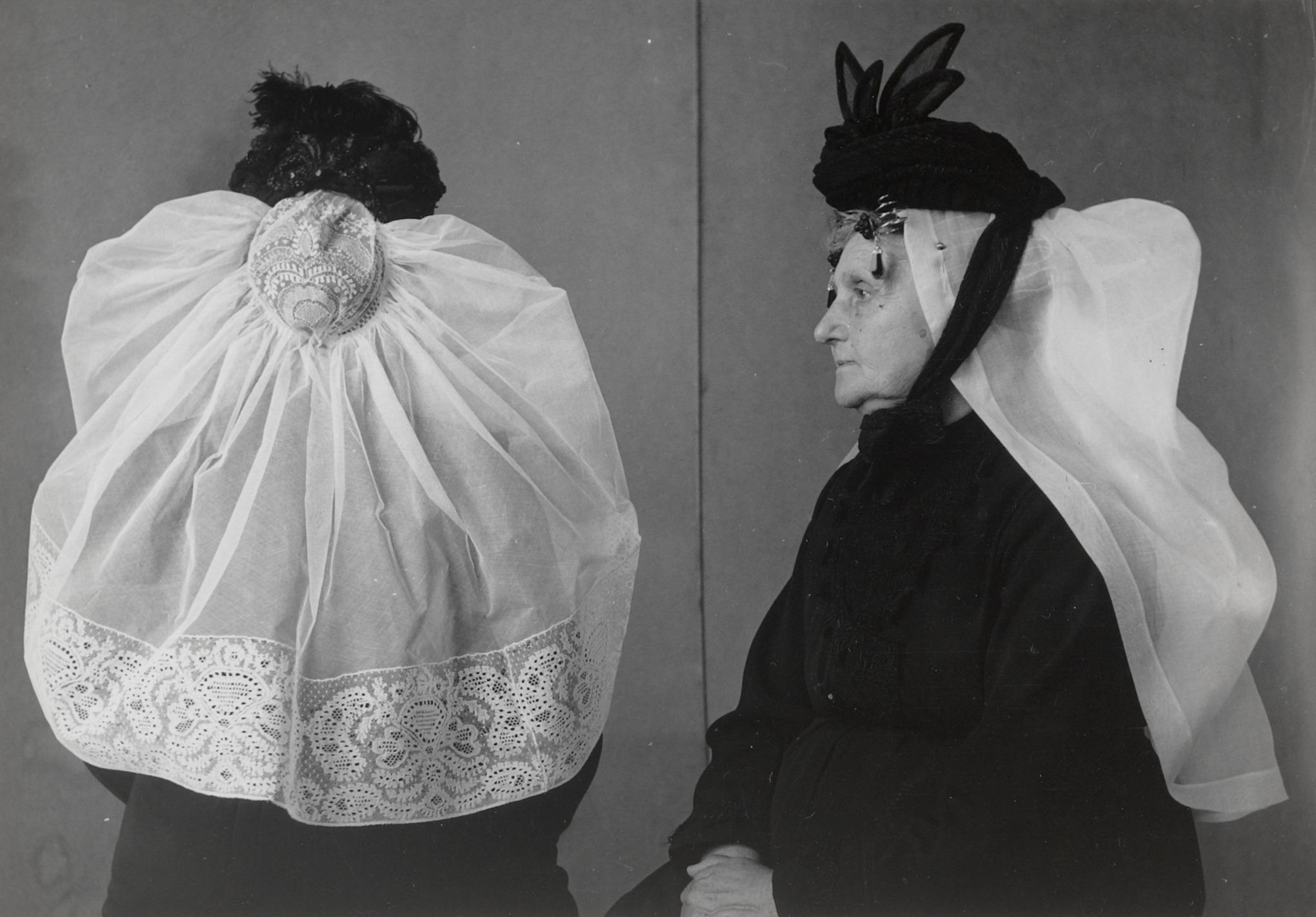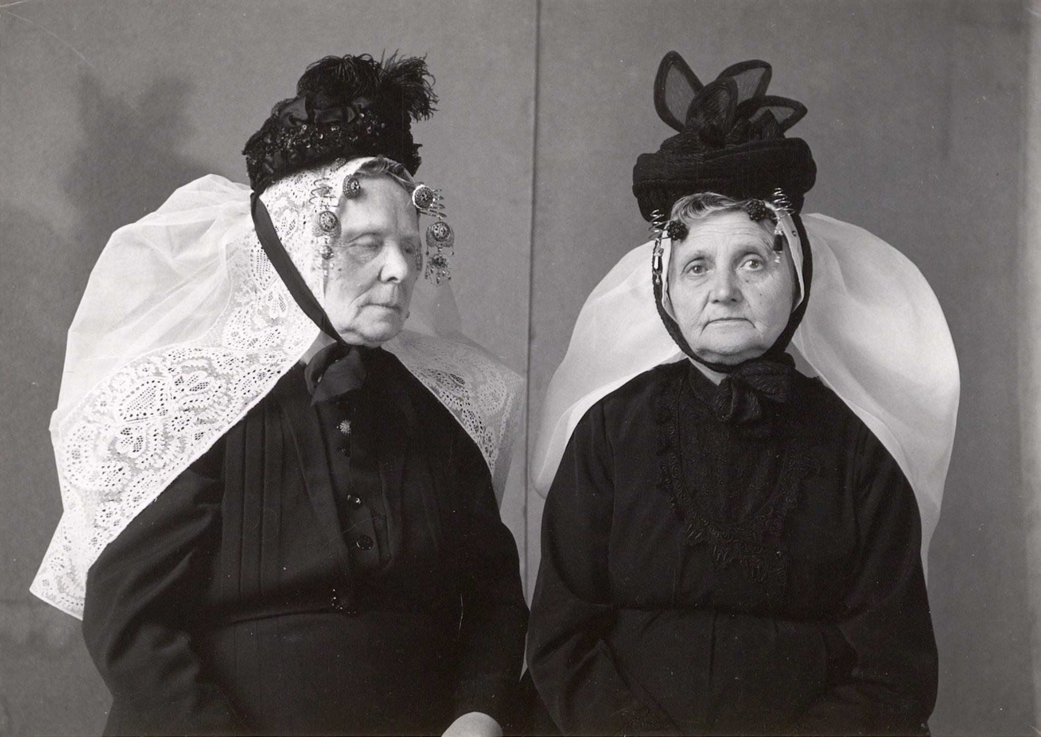 Twee vrouwen in Noord-Bevelandse dracht, 1956 (zwart...