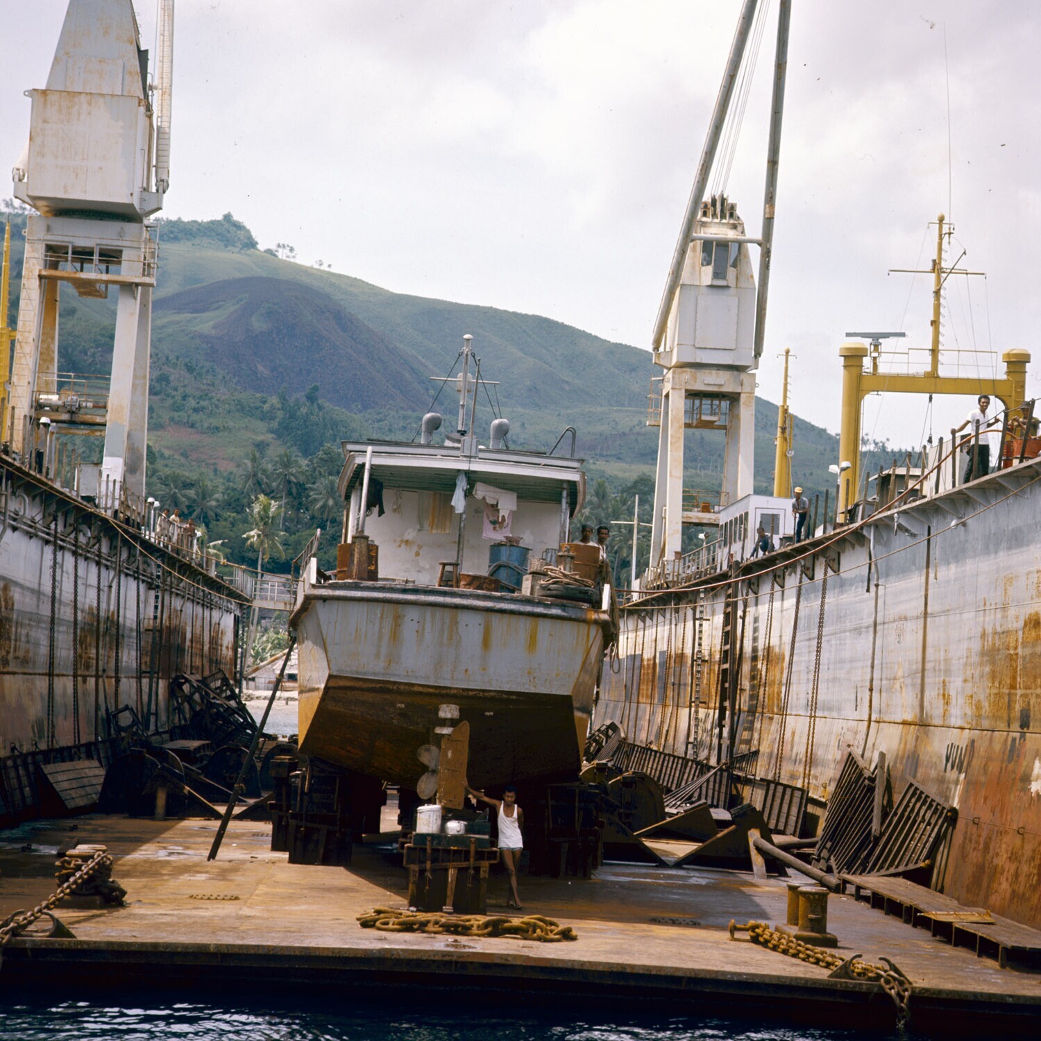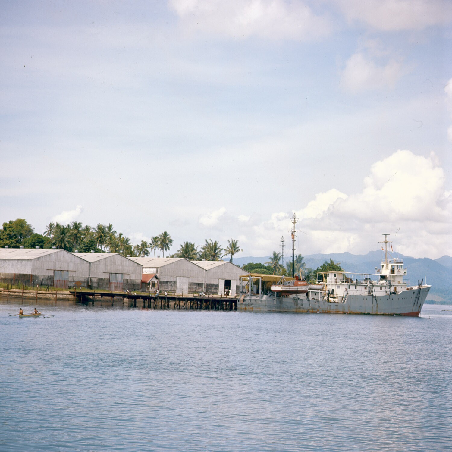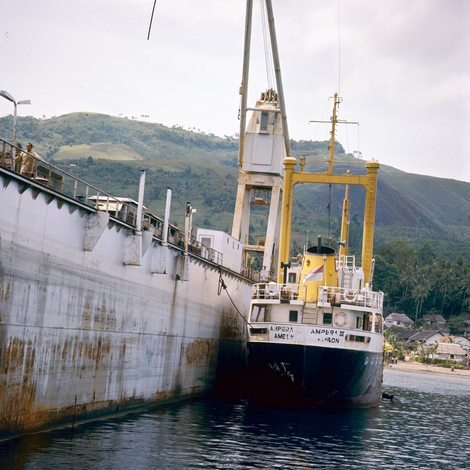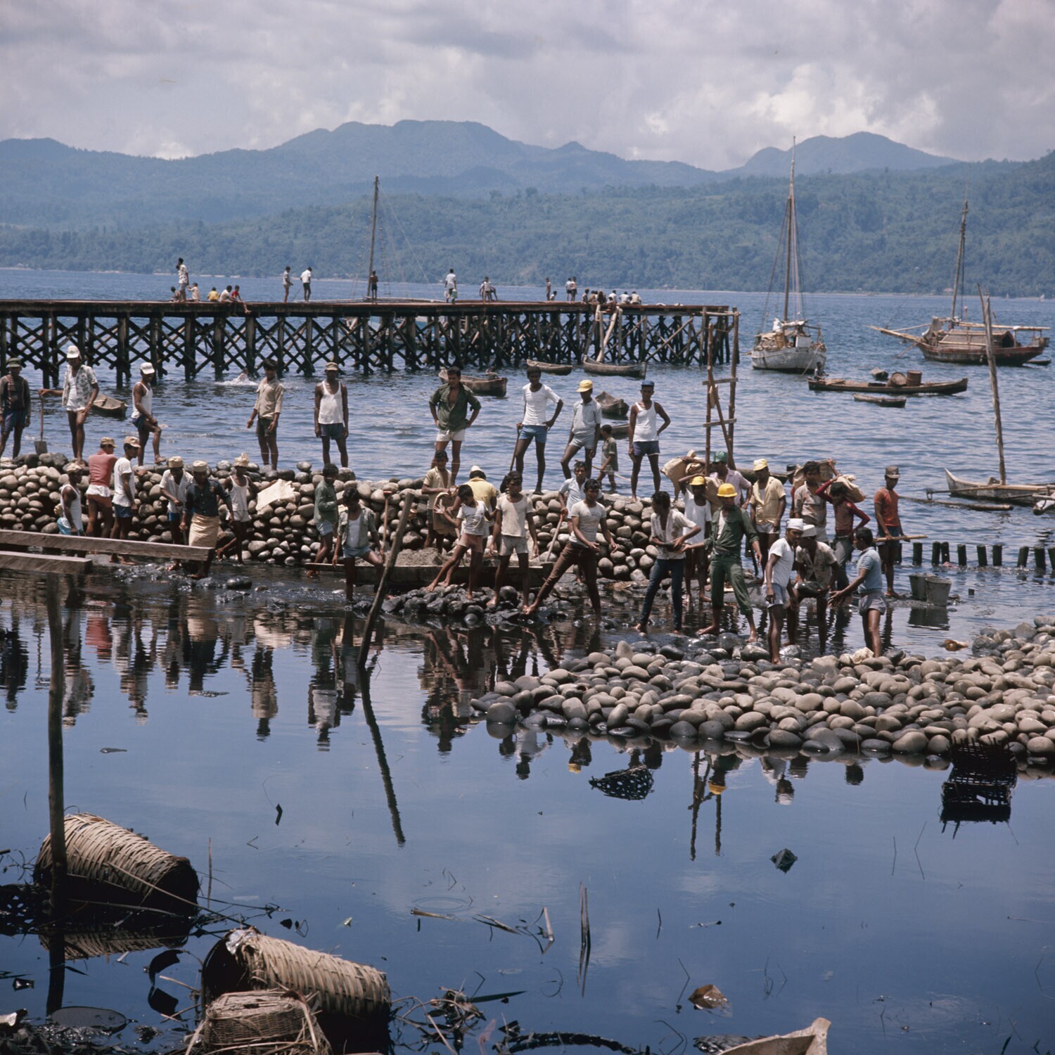 Aanleg van strekdammetjes in de haven van Ambon. Op ...