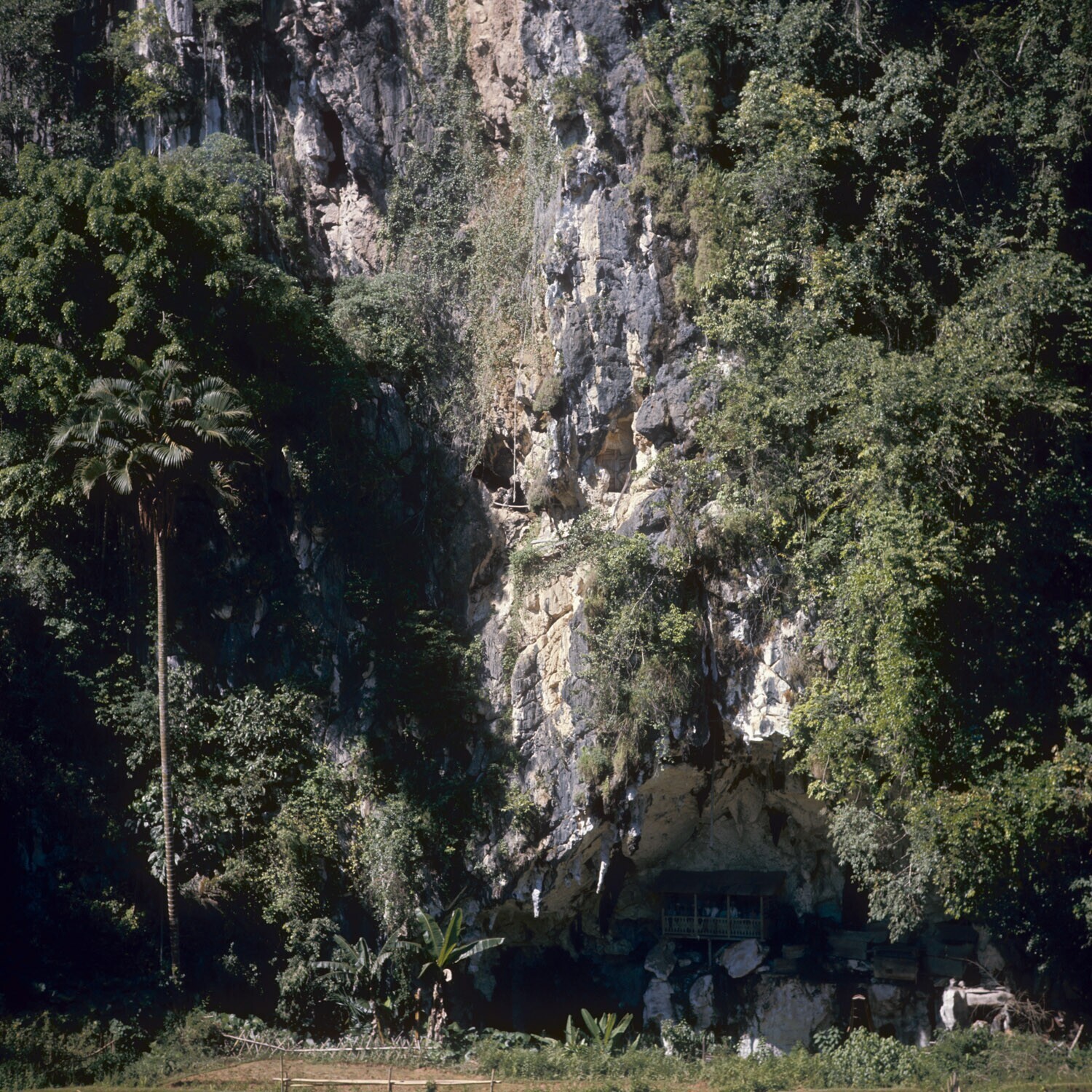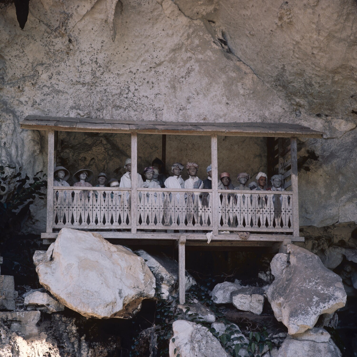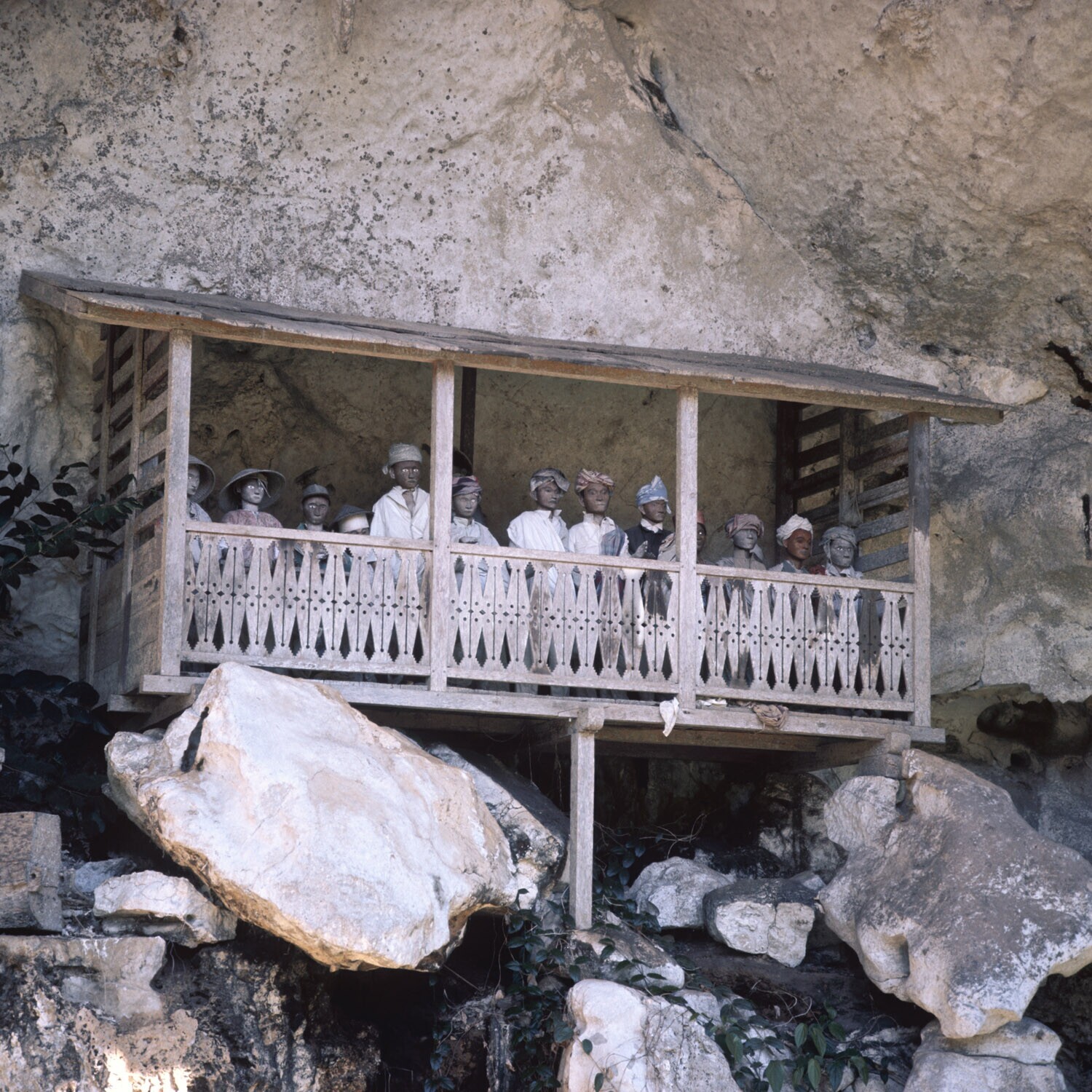 Dodenpoppen op het balkon van een Toraja rotsgraf bi...