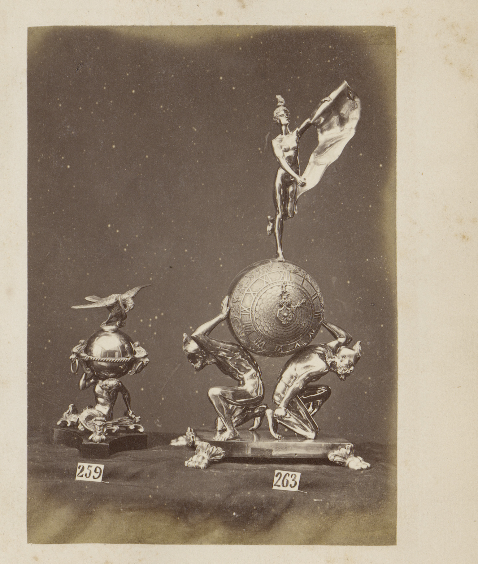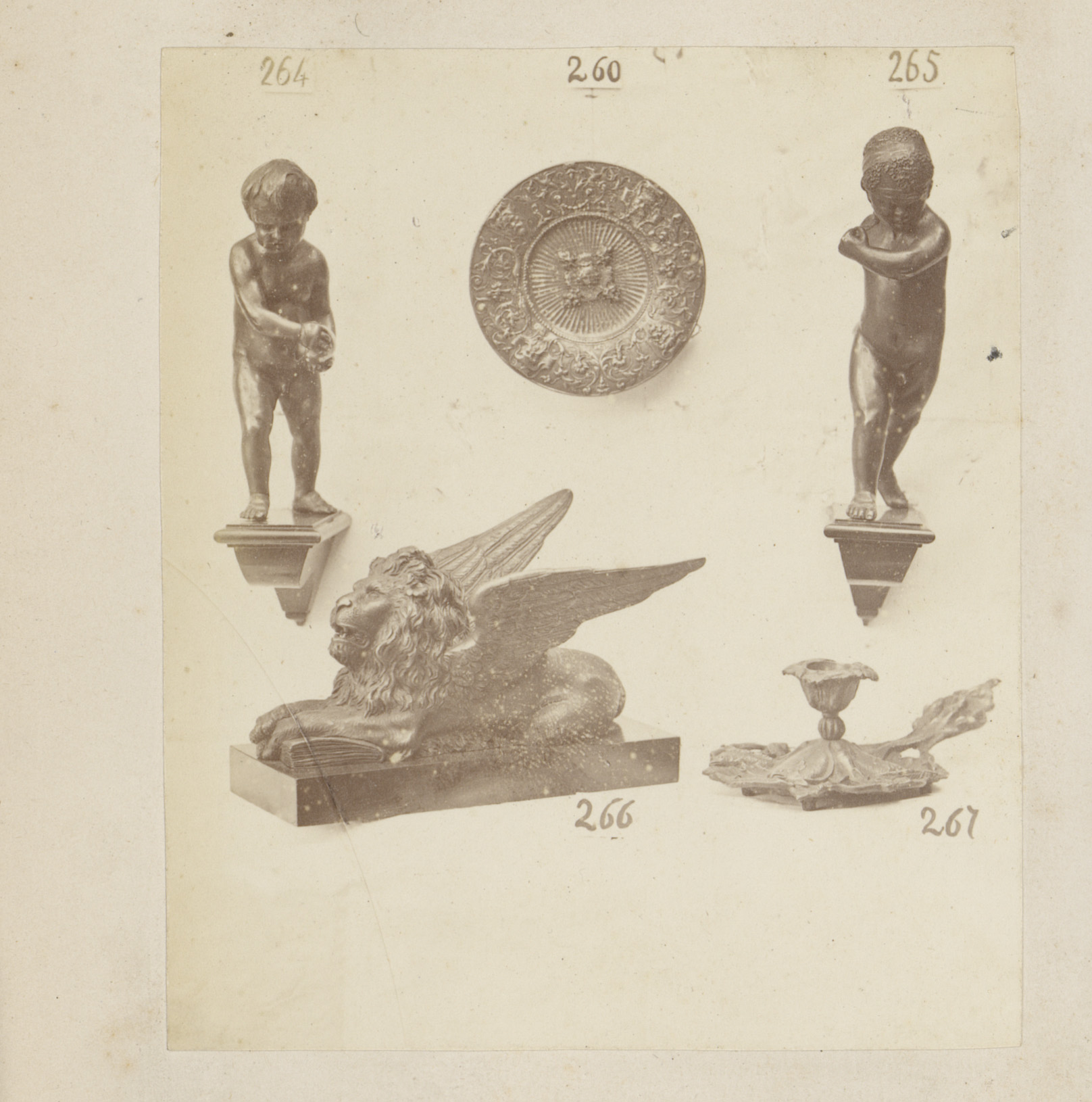 Metalen sculpturen van een sfinx en een naakt, een b...
