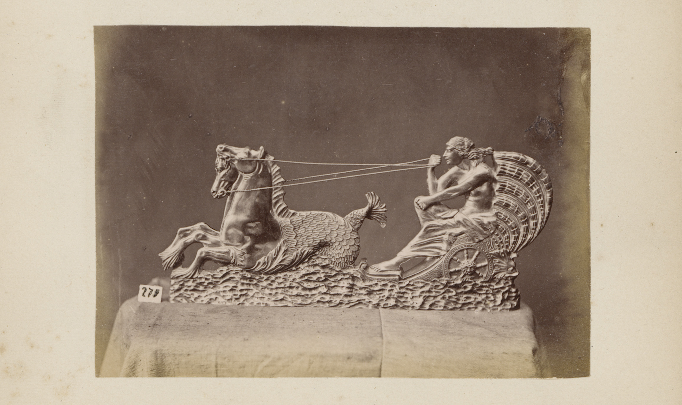 Metalen reliëf van Neptunus op zijn wagen