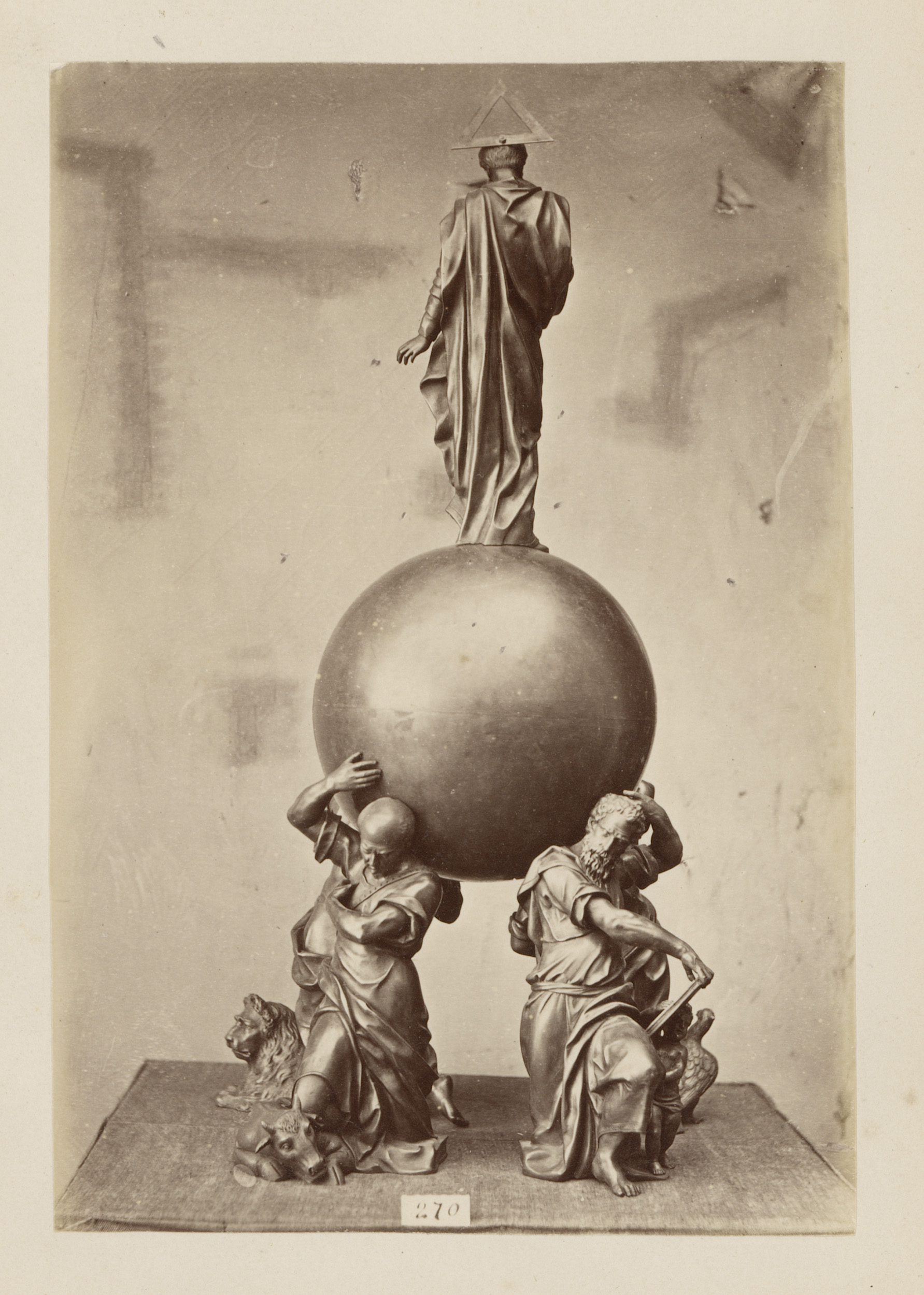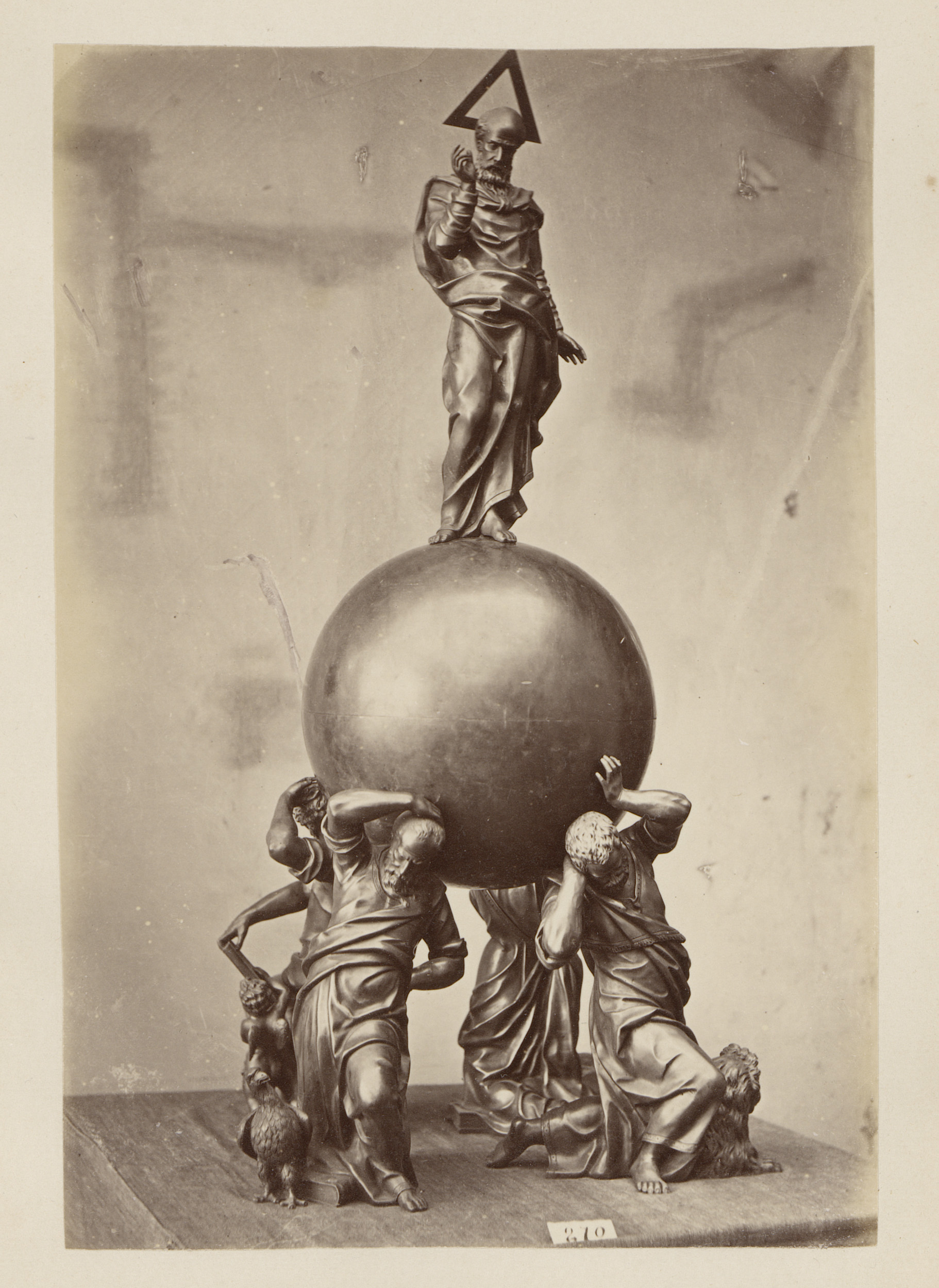 Metalen vat gedragen en bekroond door figuren