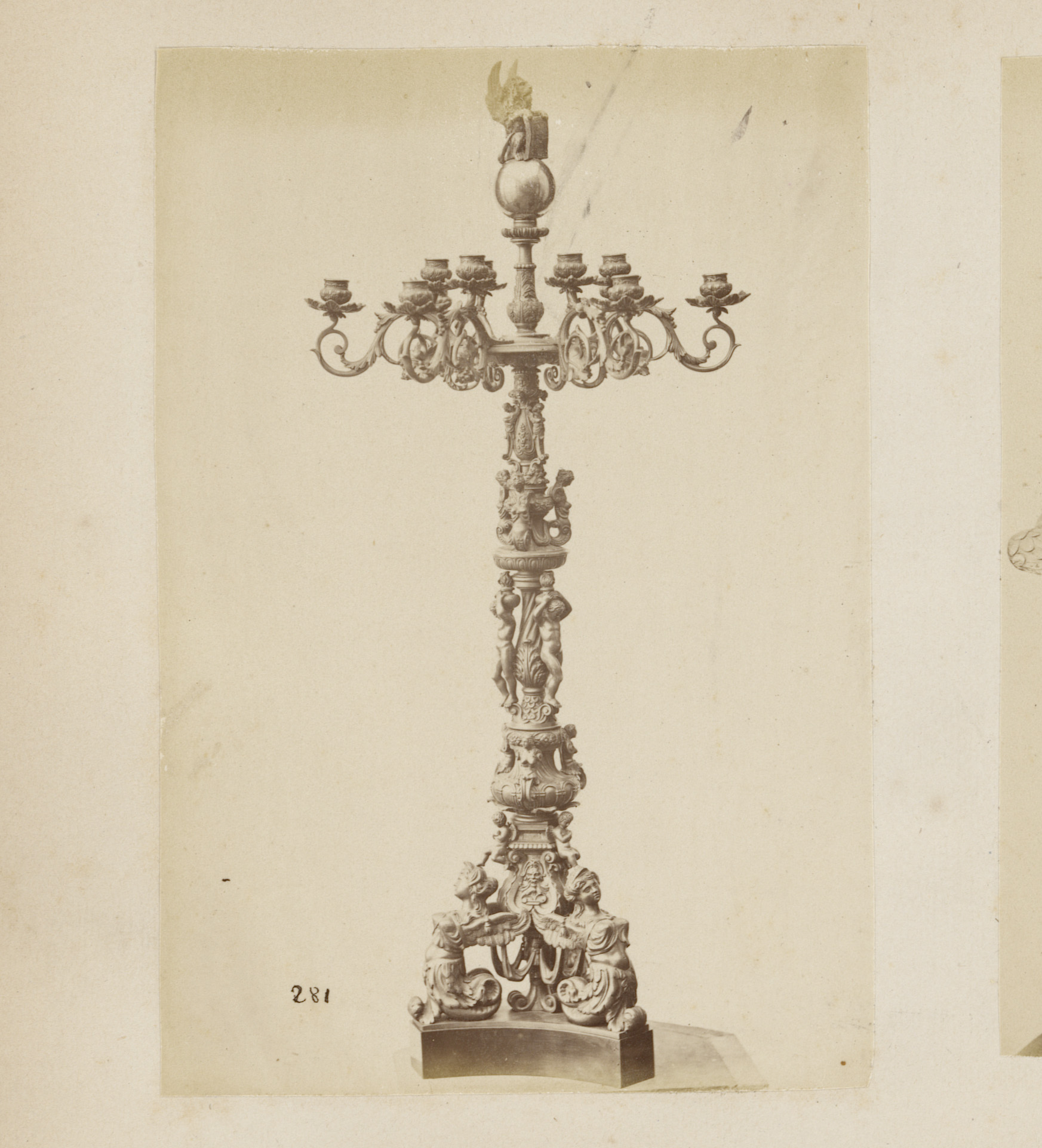 Twee metalen kandelaars met drie armen, gedragen doo...
