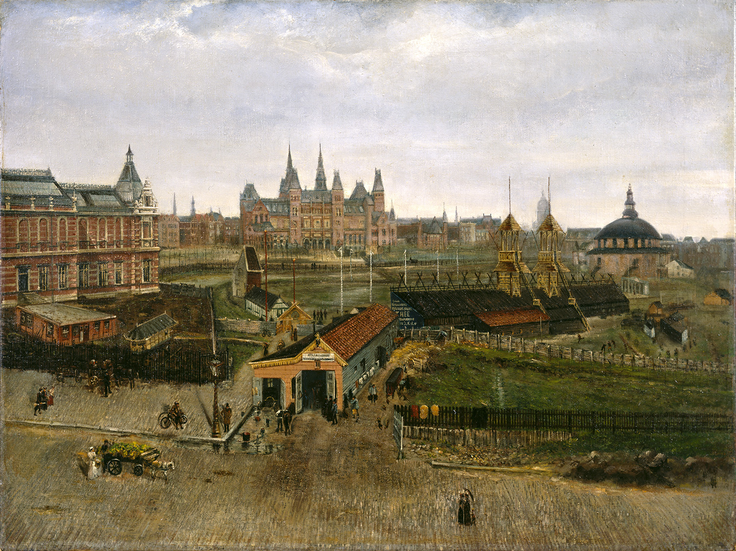 Het IJ met een vloot walvisvaarders gezien vanaf het...