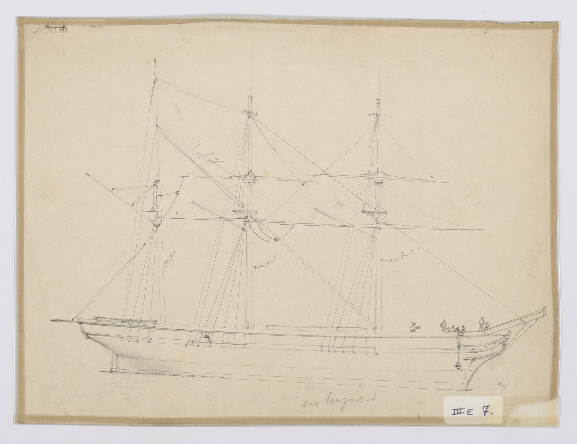 Zijaanzicht, achteraanzicht van een barkschip 1851 T...