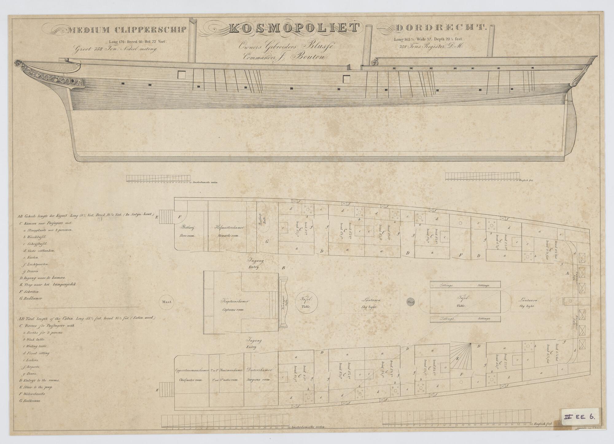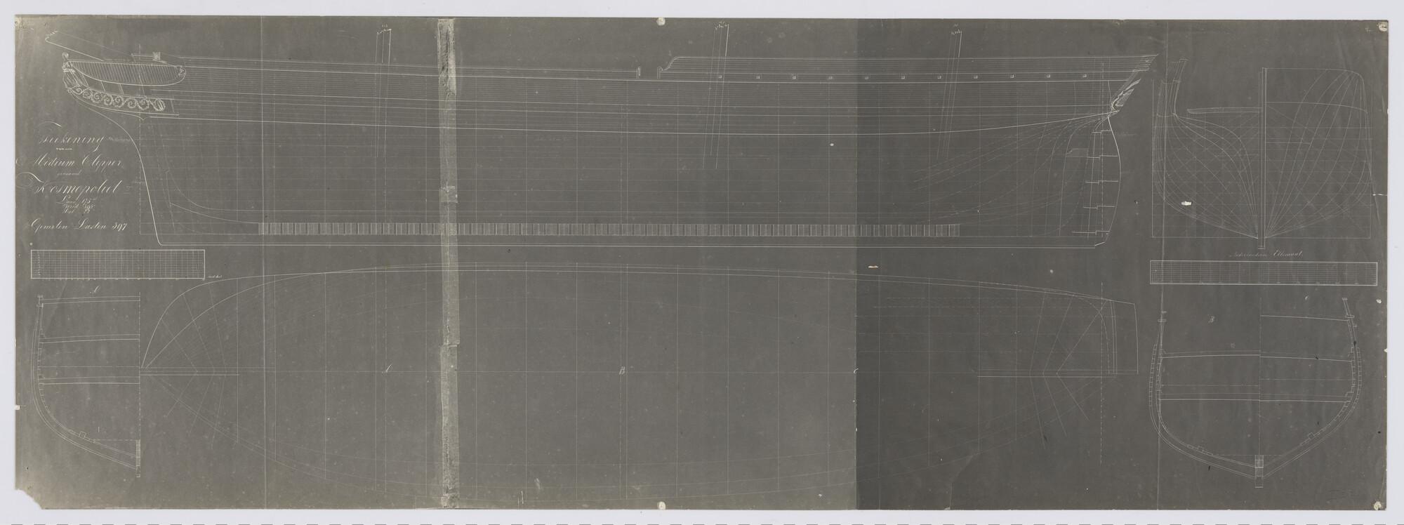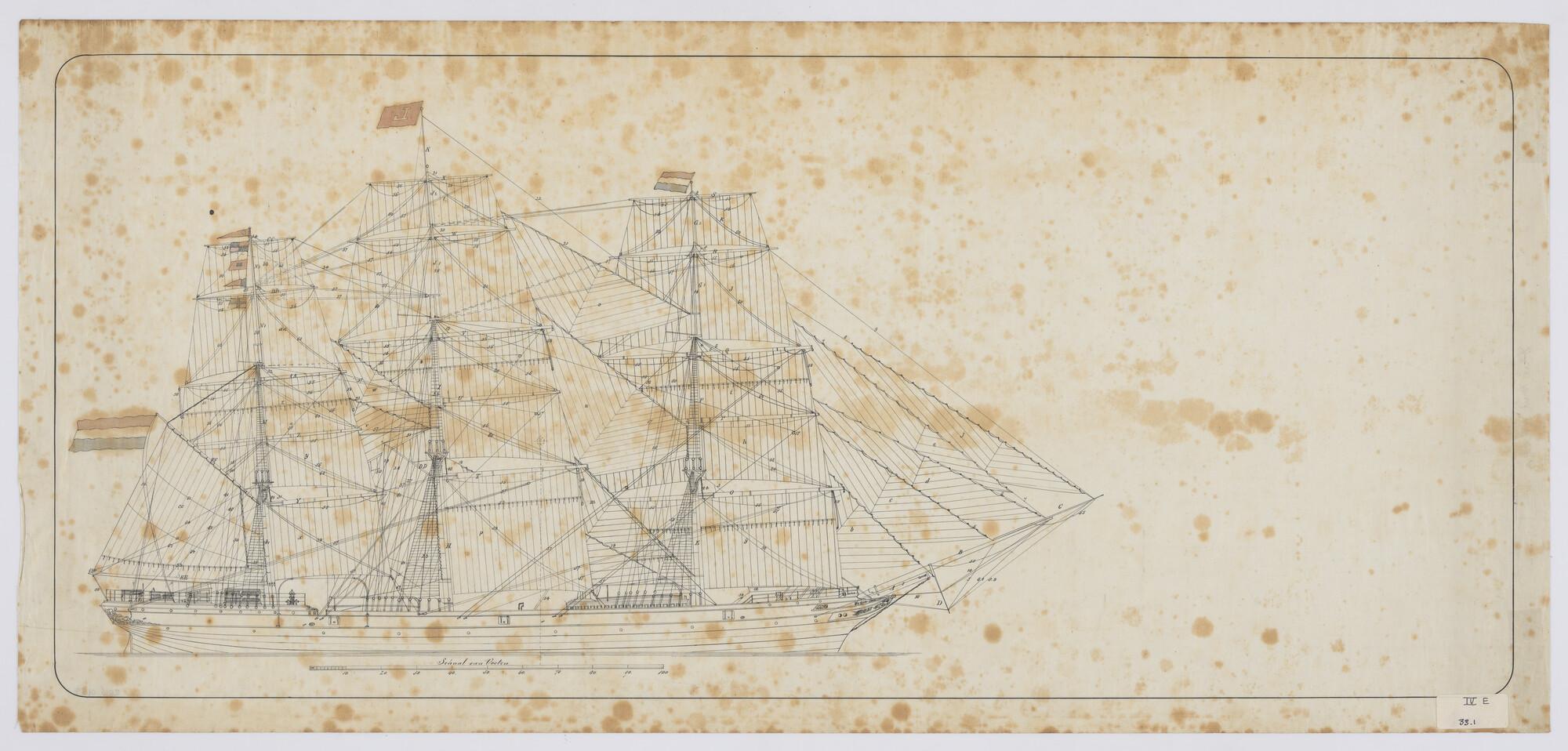 Zijaanzicht met tuigplan van de clipper Kosmopoliet