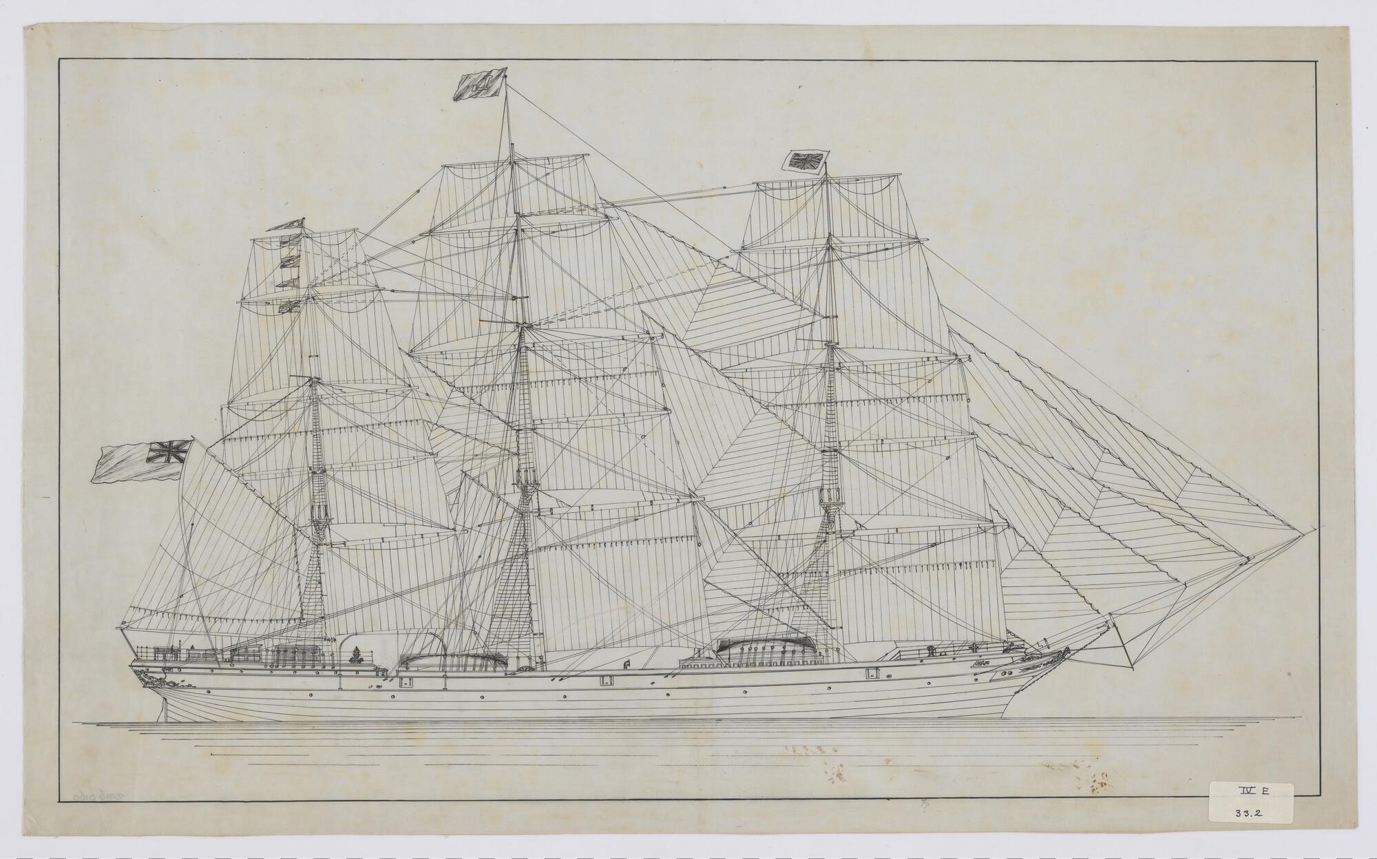 Zijaanzicht, met tuig (drie mast volschip) clipper
