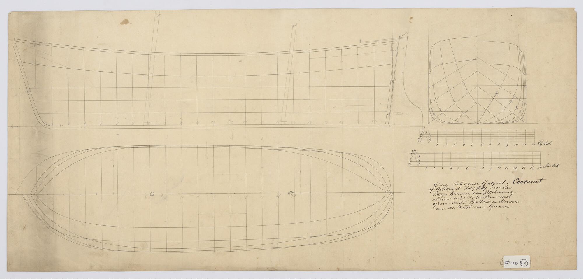 Zijaanzicht, lijnenplan, van de schoenergaljoot 'Con...