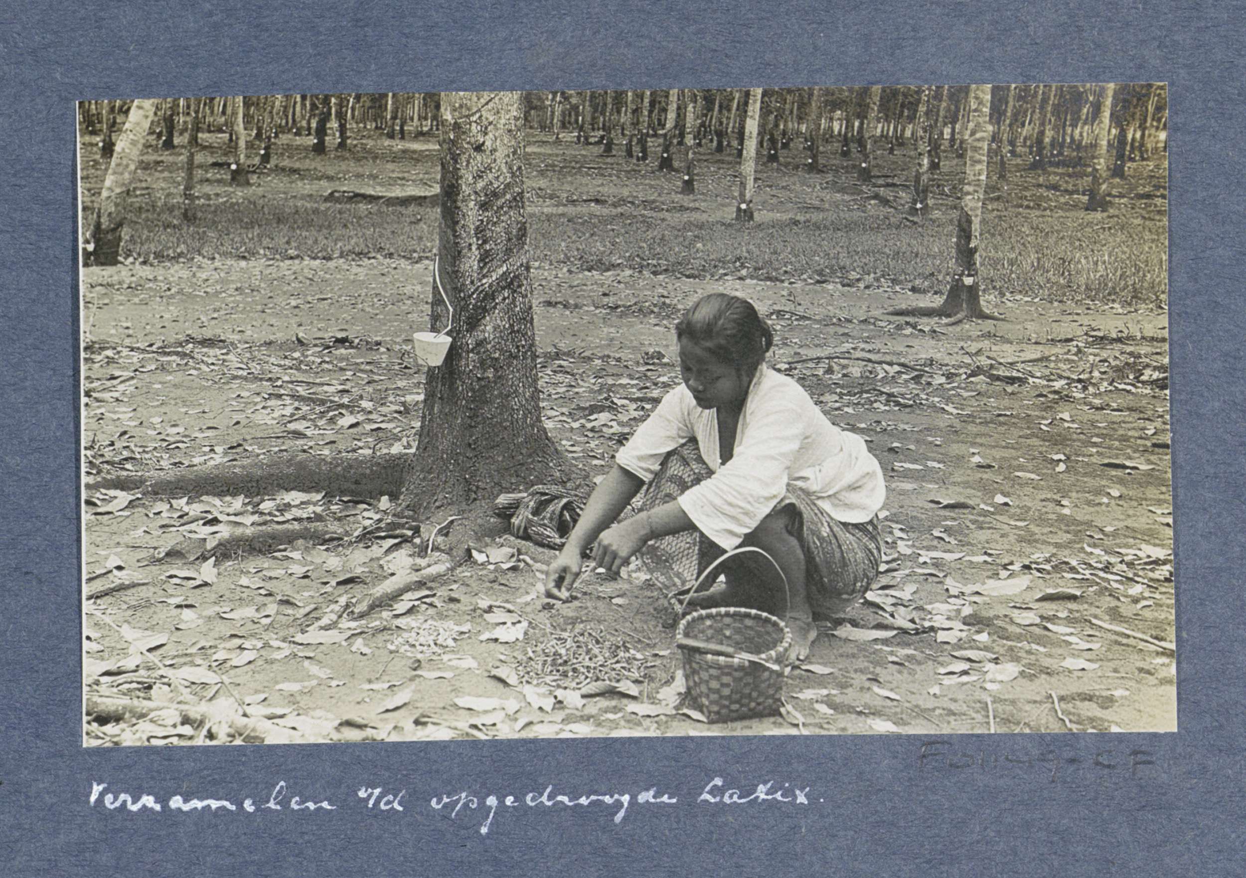 Vrouw verzamelt opgedroogde latex (rubbersap) op pla...
