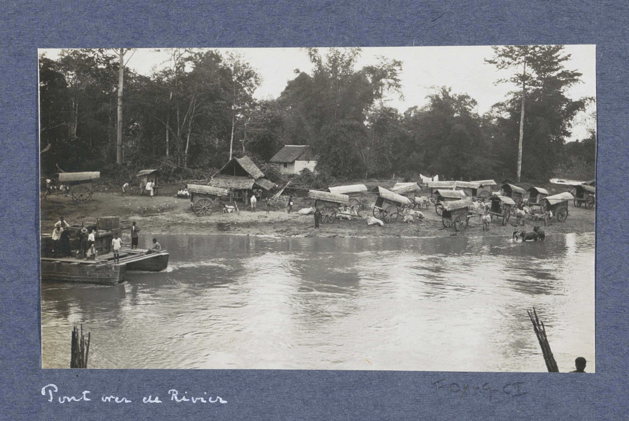 Pont over een rivier op Sumatra, ossenwagens op de o...