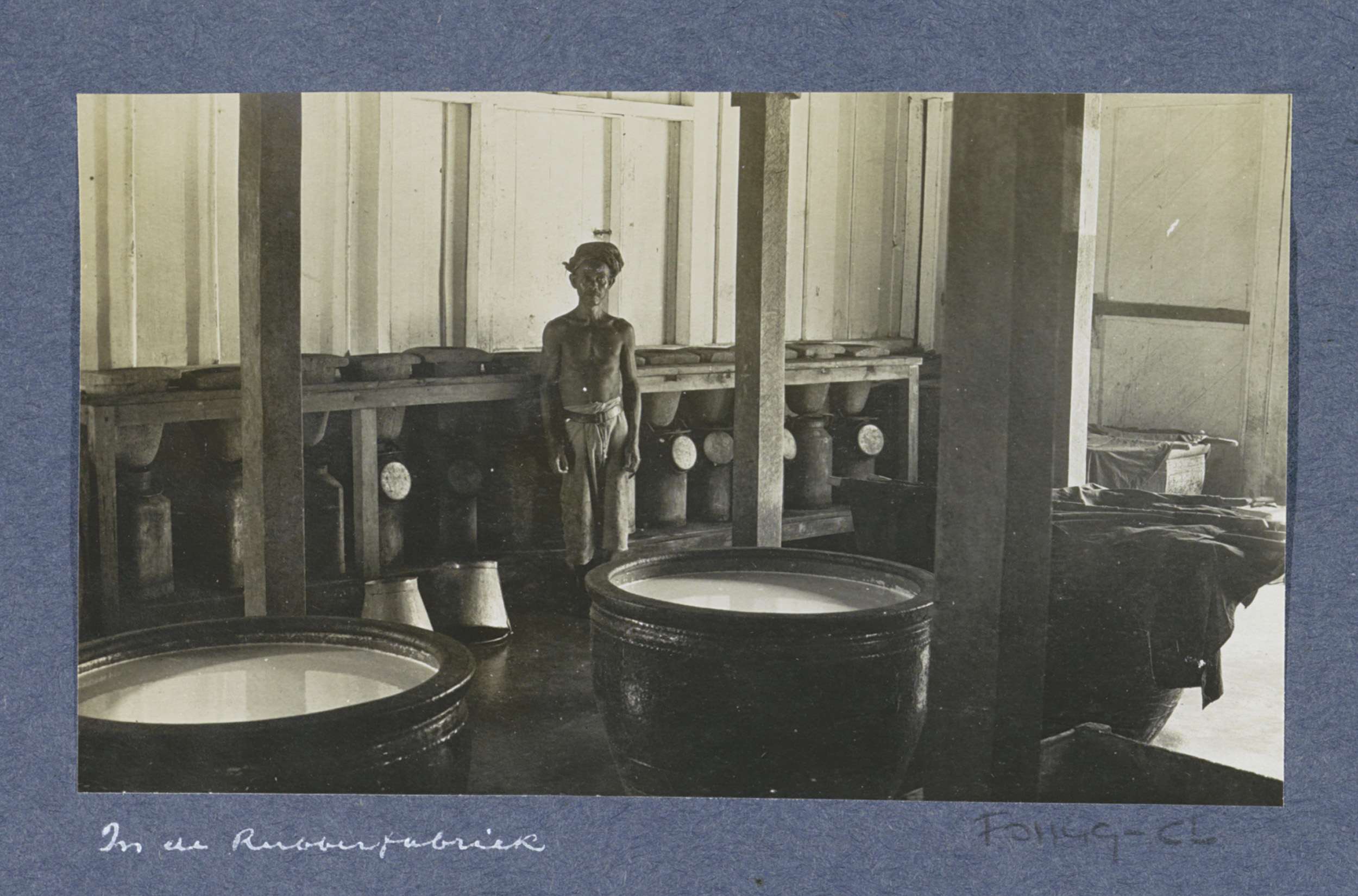 Arbeider bij vaten in een rubberfabriek op Sumatra