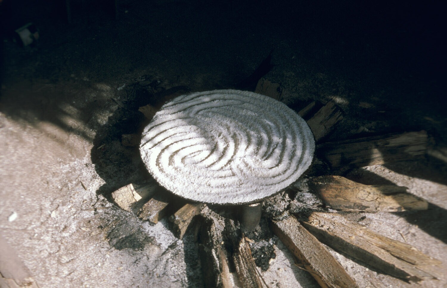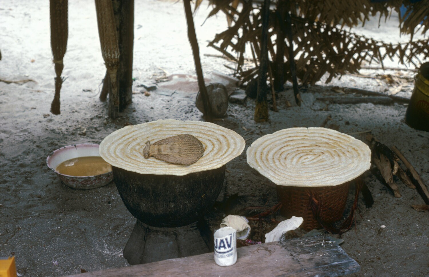 Het cassavemeelmengsel uitgespreid op een hete plaat...