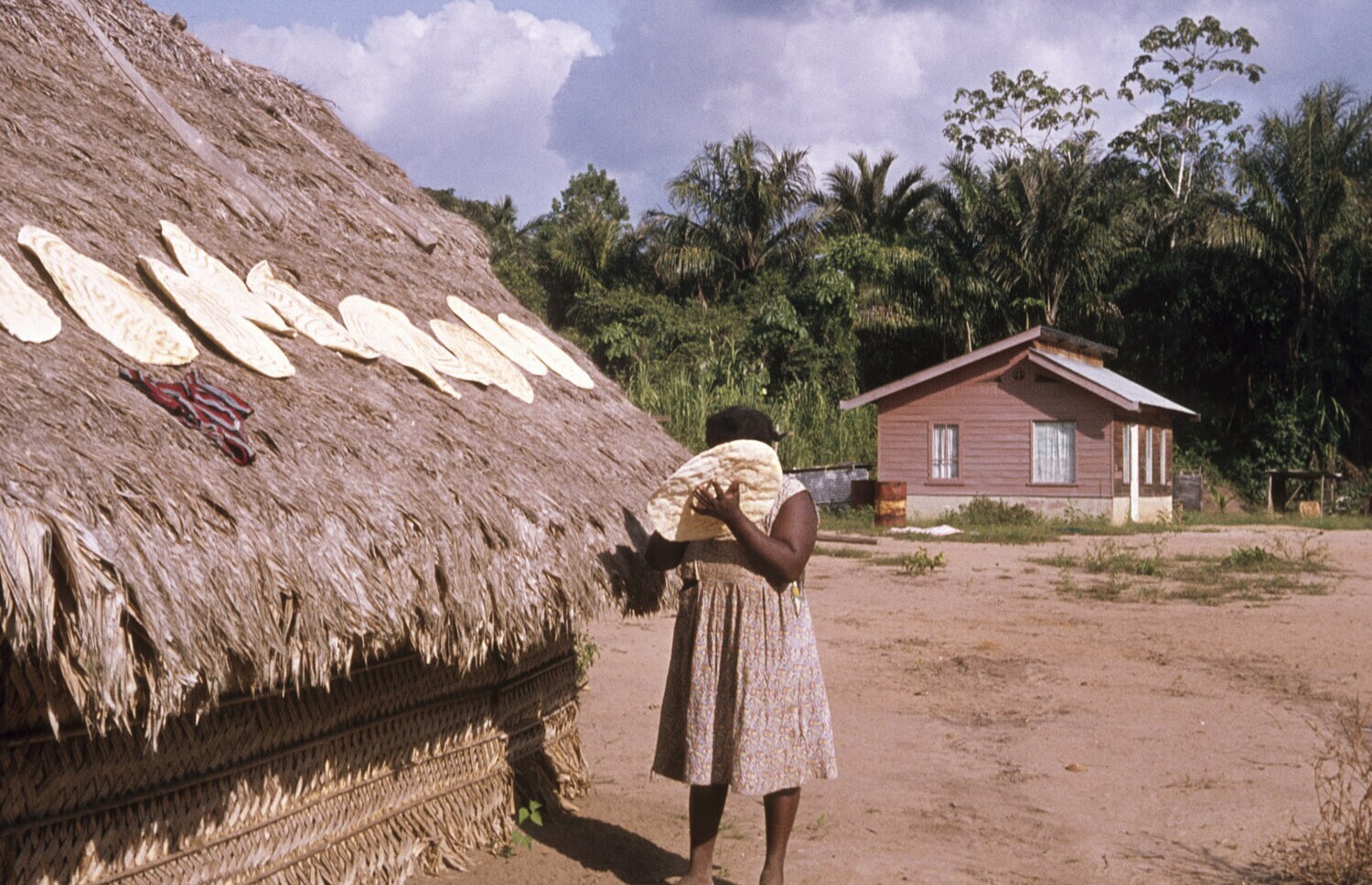 Vrouw bezig met de bereiding van cassavebrood in het...