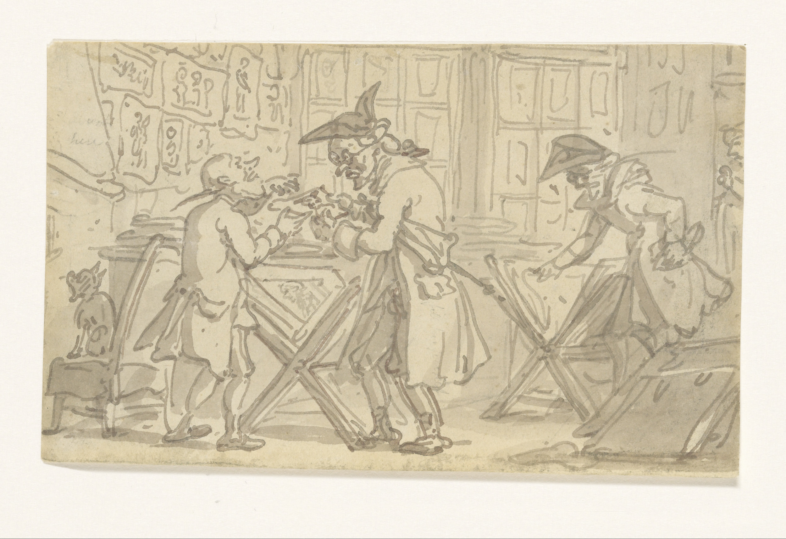 Interieur met drie mannen die naar een prent kijken
