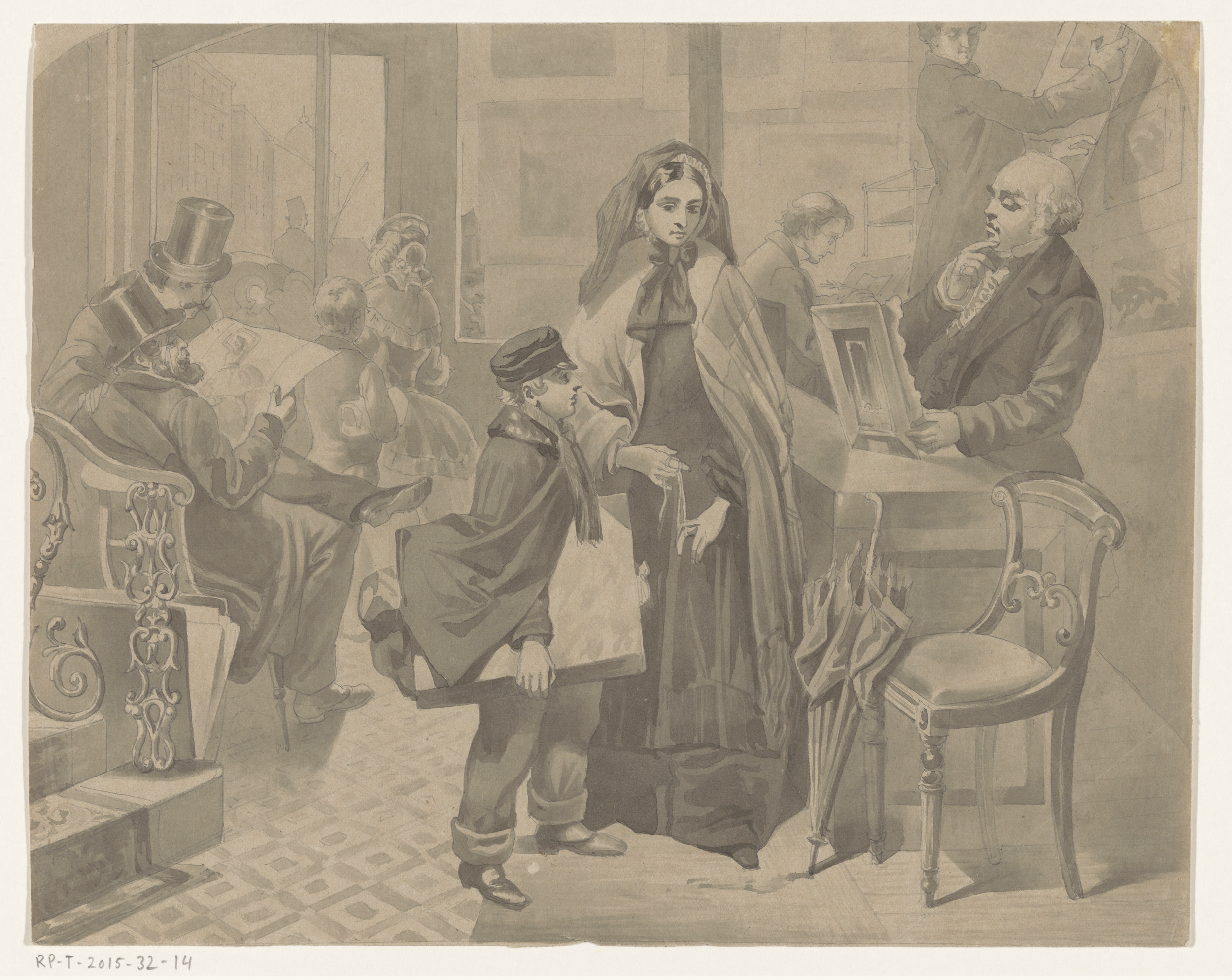 Moeder en zoon bij een kunsthandelaar