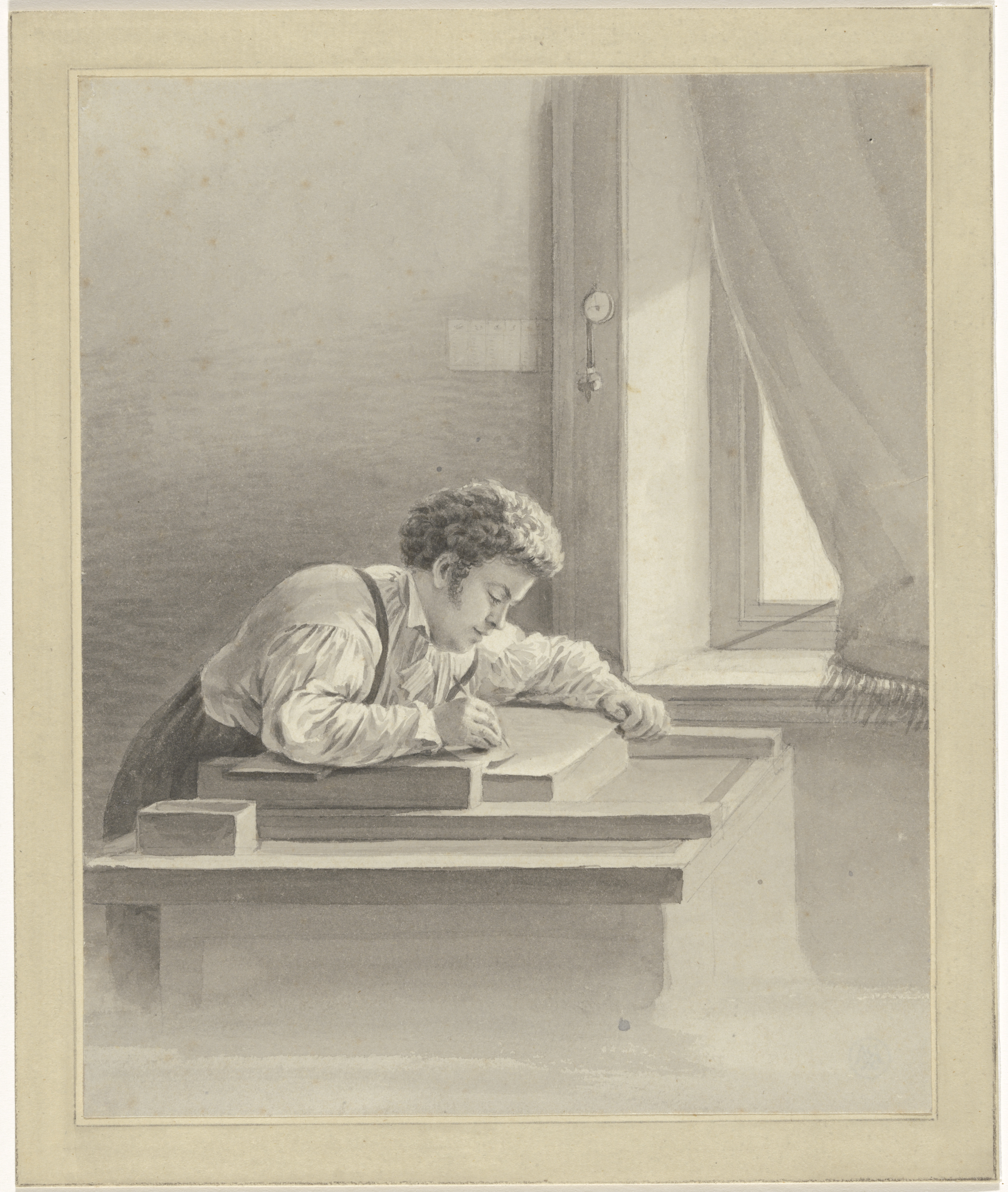 Kunstenaar tekenend op een lithosteen