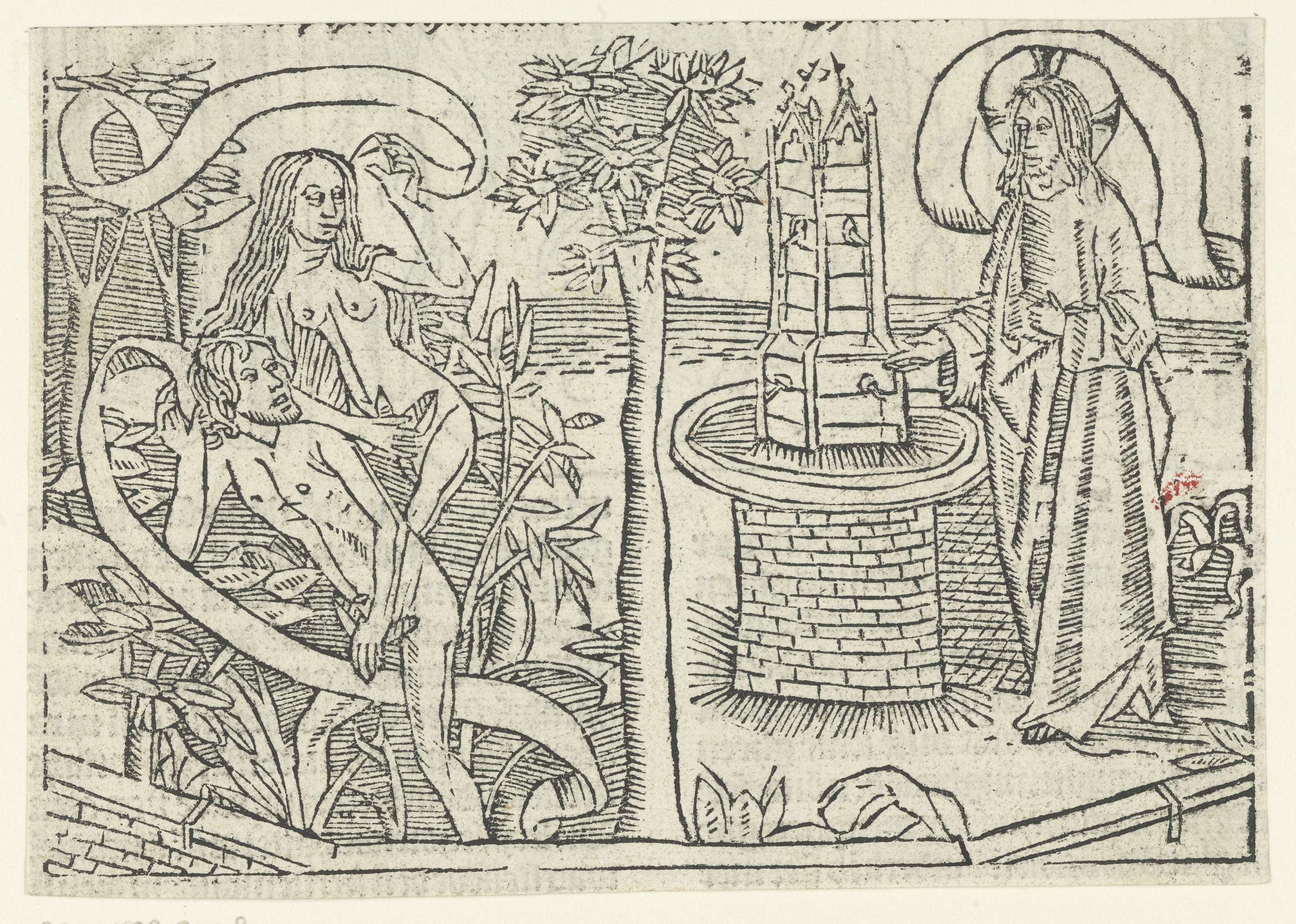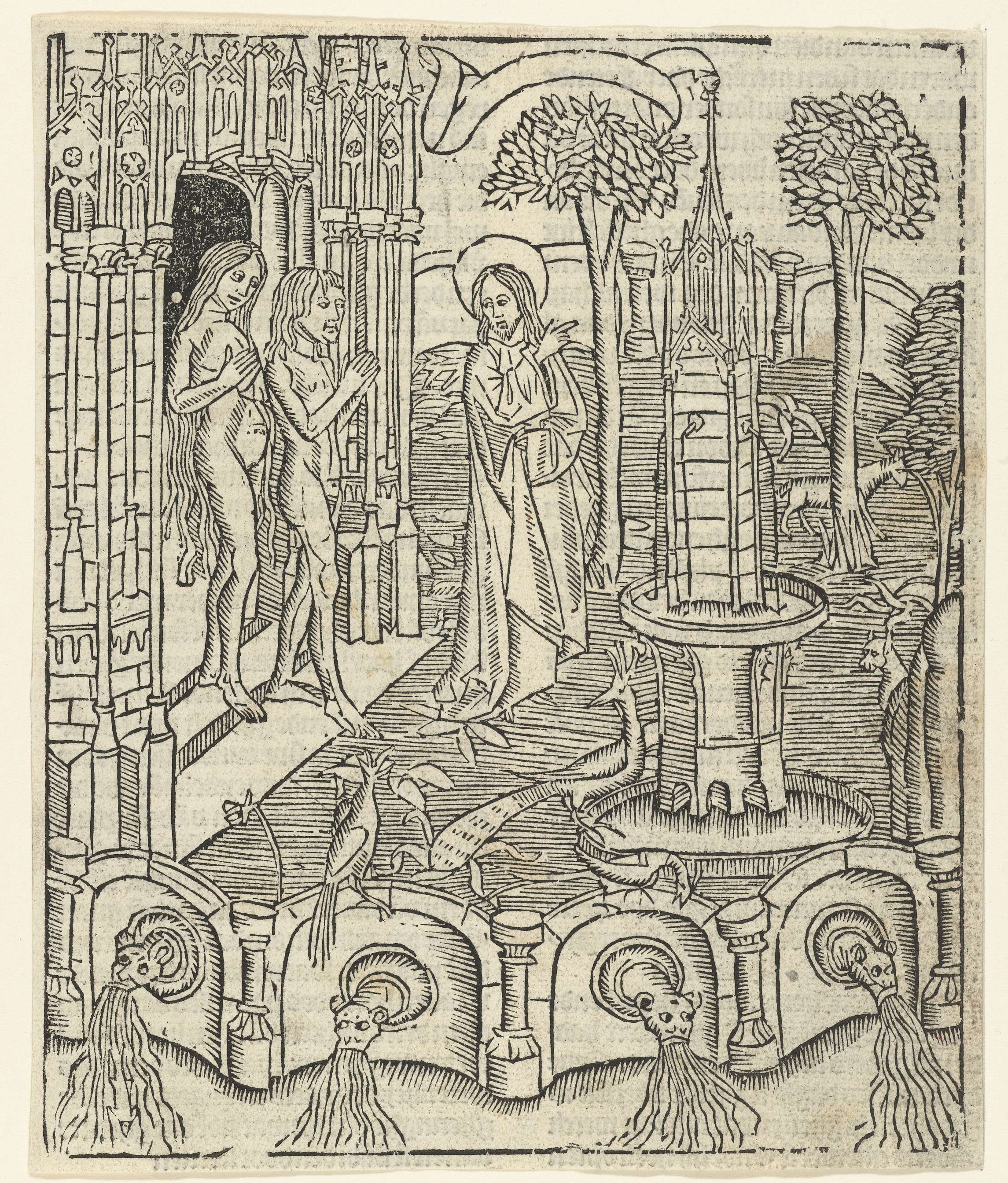 God toont Adam en Eva het Paradijs