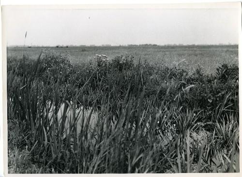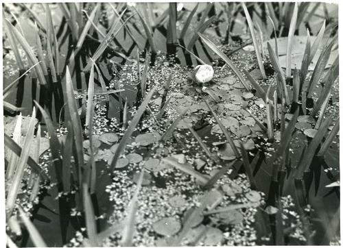 Foto in zwart-wit van een sloot met waterplanten doo...