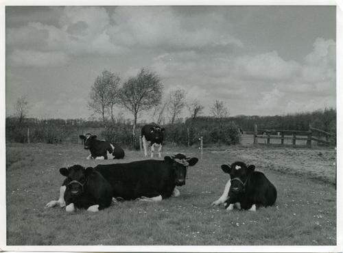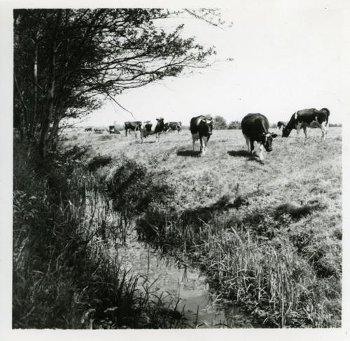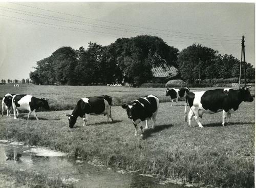 Foto in zwart-wit van koeien op de dijk door J.D. de...